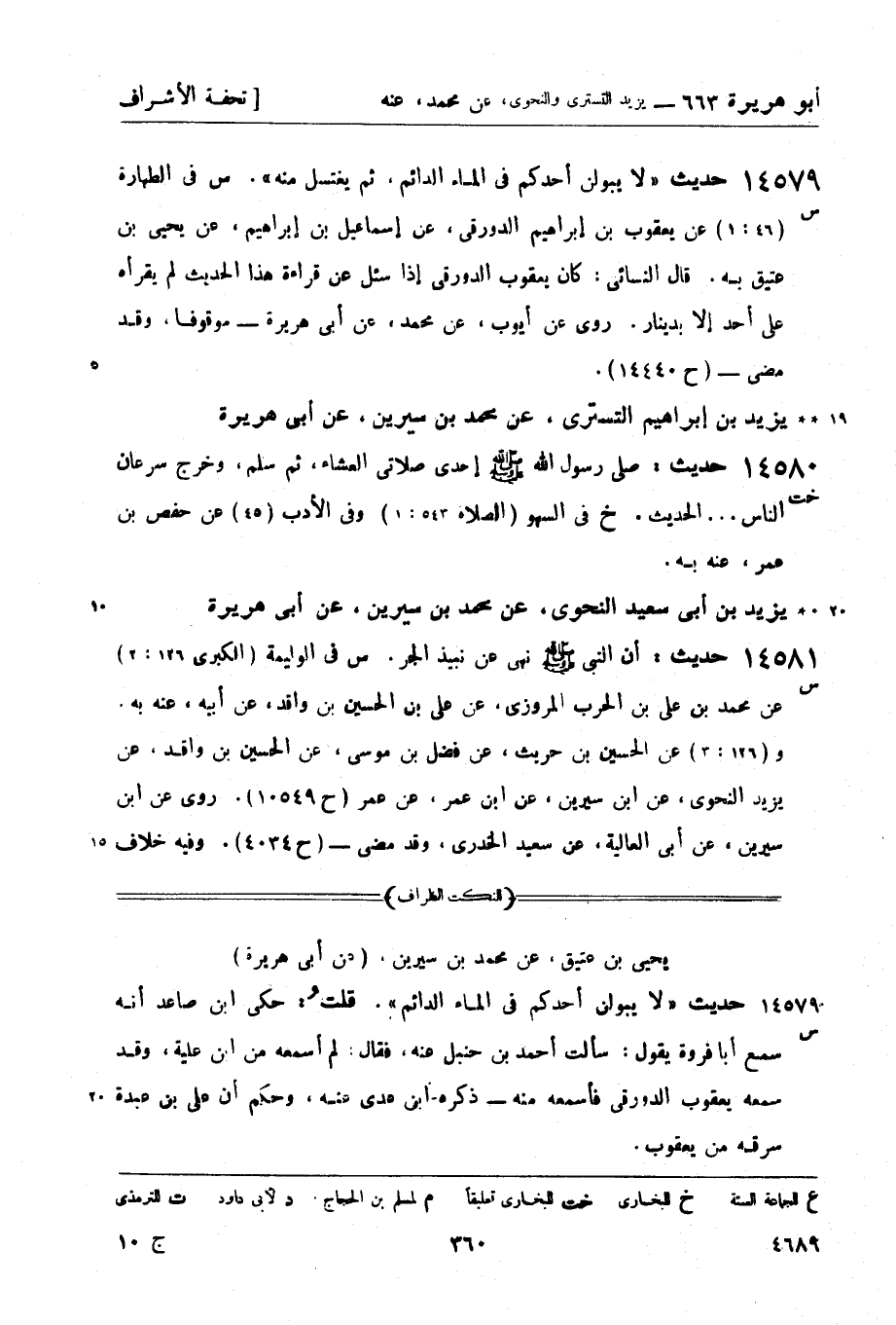 14579 -[س] حديث لا يبولن أحدكم في الماء الدائم، ثم يغتسل منه. (س) في الطهارة (46: 1) عن يعقوب بن إبراهيم الدورقي، عن إسماعيل بن إبراهيم، عن يحيى بن عتيق به. قال النسائي: كان يعقوب الدورقي إذا سئل عن قراءة هذا الحديث لم يقرأه على أحد إلا بدينار. روي عن أيوب، عن محمد، عن أبي هريرة - موقوفاً، وقد مضى - (ح 14440) .