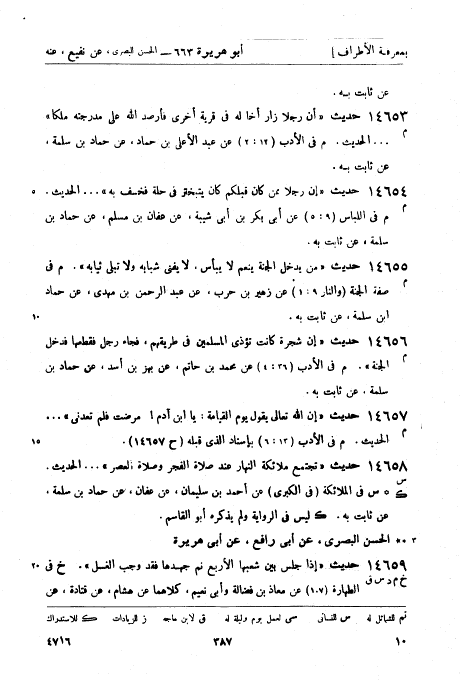 م فيه (الطهارة 56: 1) عن أبي خيثمة زهير بن حرب وأبي غسان المسمعي وابن مثنى وابن بشار، أربعتهم عن معاذ بن هشام، عن أبيه، عن قتادة ومطر الوراق، كلاهما عن الحسن به. و (56: 2) عن محمد بن عمرو بن جبلة، عن ابن أبي عدي - و (6: 2) عن ابن مثنى، عن وهب بن جرير - كلاهما عن شعبة به.