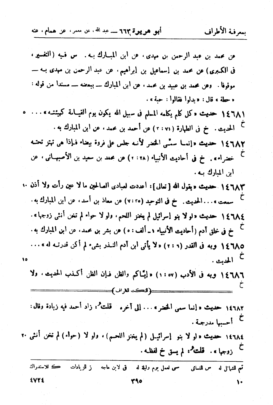 14682 -[خ] حديث إنما سمِّي الخضر لأنه جلس على فروة بيضاء فإذا هي تهتز تحته خضراء. (خ) في أحاديث الأنبياء (28: 2) عن محمد بن سعيد بن الأصبهاني، عن ابن المبارك به.