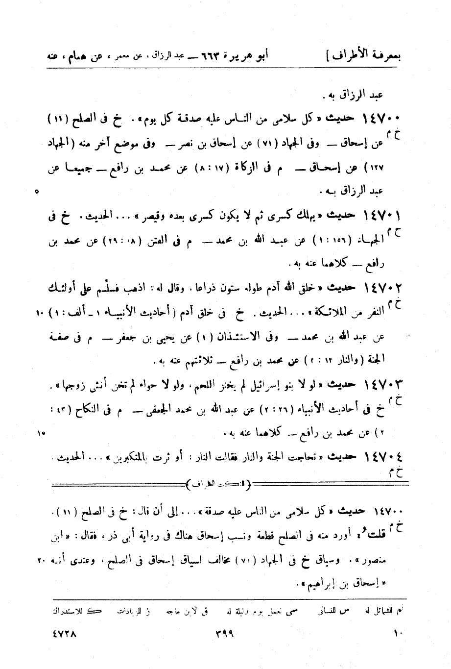 14700 -[خ م] حديث كل سلامي من الناس عليه صدقة كل يوم. (خ) في الصلح (11) عن إسحاق - وفي الجهاد (71) عن إسحاق بن نصر - وفي موضع آخر منه (الجهاد 127) عن إسحاق -