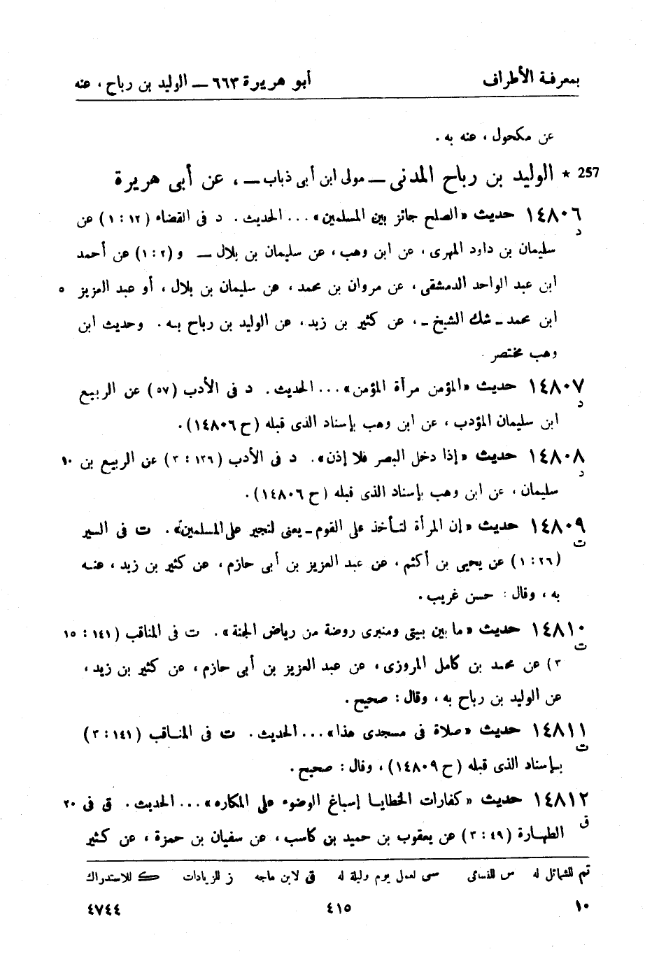 14810 -[ت] حديث ما بين بيتي ومنبري روضة من رياض الجنة. (ت) في المناقب (141: 3) عن محمد بن كامل المروزي، عن عبد العزيز بن أبي حازم، عن كثير بن زيد، عن الوليد بن رباح به، وقال: صحيح.