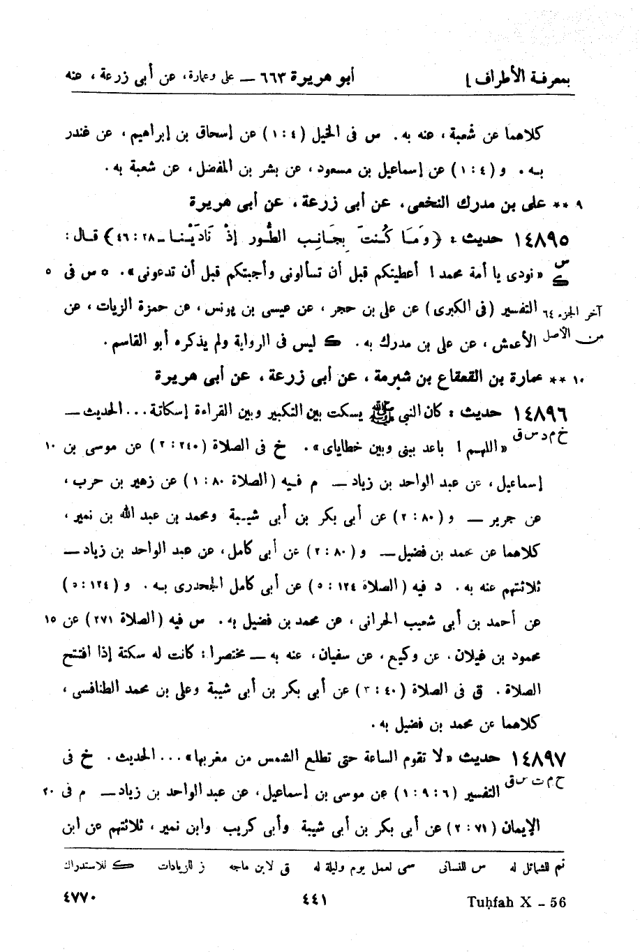 م فيه (الصلاة 80: 1) عن زهير بن حرب، عن جرير - و (80: 2) عن أبي بكر بن أبي شيبة ومحمد بن عبد الله بن نمير، كلاهما عن محمد بن فضيل - و (80: 2) عن أبي كامل، عن عبد الواحد بن زياد - ثلاثتهم عنه به.