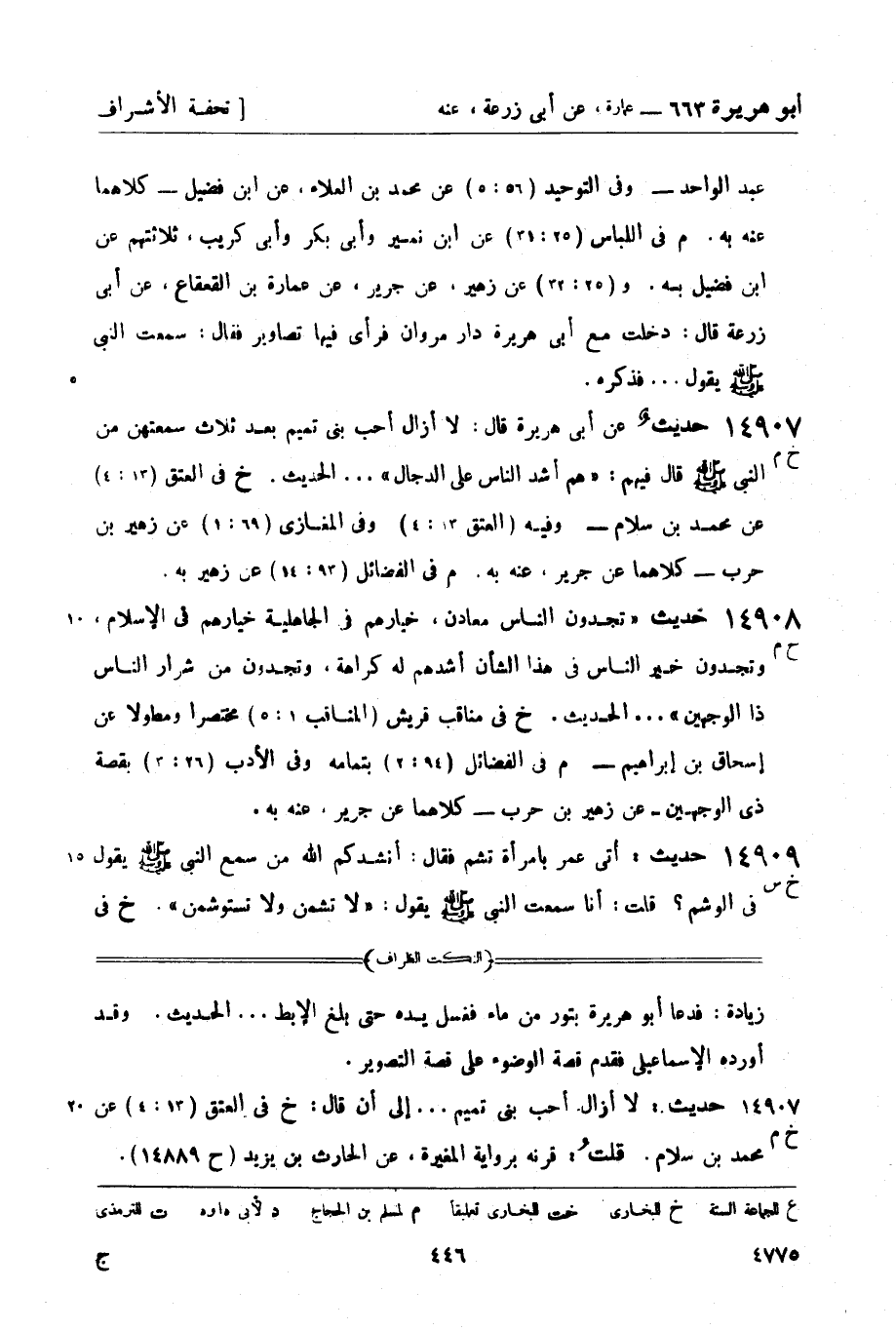 14908 - (ح م) حديث تجدون الناس معادن، خيارهم في الجاهلية خيارهم في الإسلام، وتجدون خير الناس في هذا الشأن أشدهم له كراهة، وتجدون من شرار الناس ذا الوجهين ... الحديث. (خ) في مناقب قريش (المناقب 1: 5) مختصراً ومطولاً عن إسحاق بن إبراهيم - (م) في الفضائل (94: 2) بتمامه وفي الأدب (26: 3) بقصة ذي الوجهين - عن زهير بن حرب - كلاهما عن جرير، عنه به.