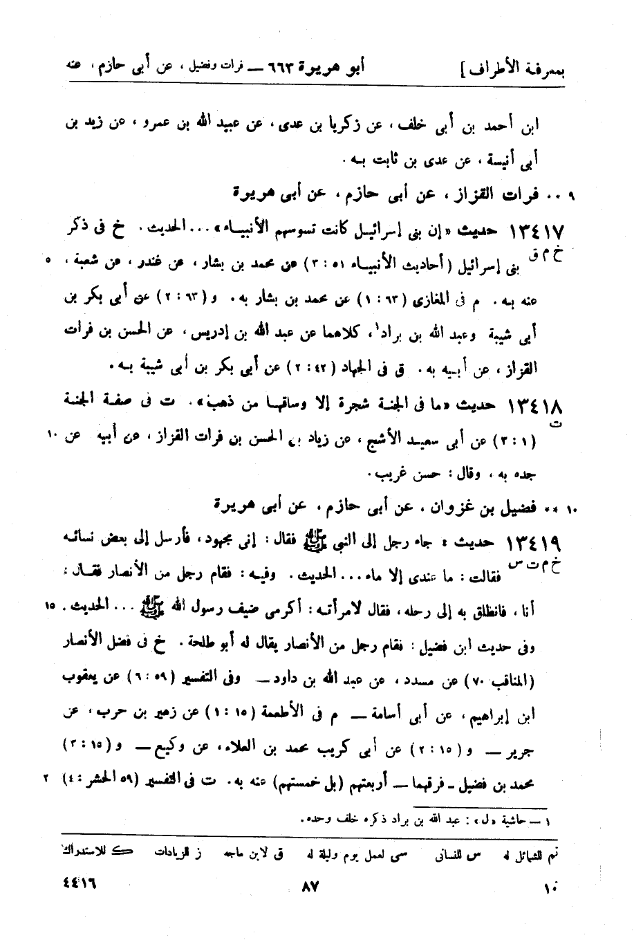 13417 - فرات القزاز، عن أبي حازم، عن أبي هريرة 13417 (خ م ق) حديث إن بني إسرائيل كانت تسوسهم الأنبياء ... الحديث،