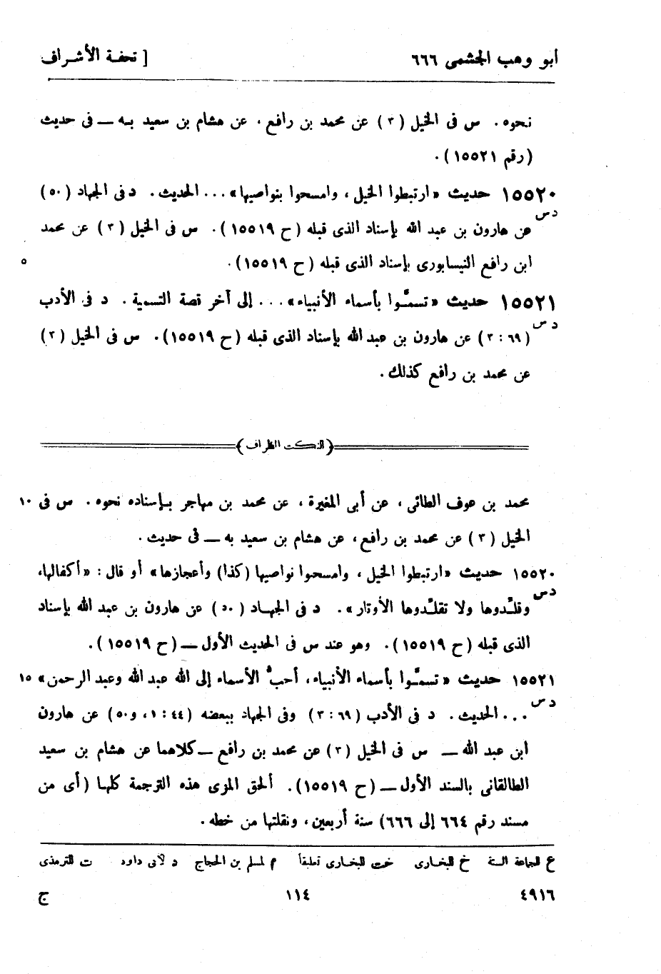 15521 -[د س] حديث: تسمَّوا بأسماء الأنبياء، أحبُّ الأسماء إلى الله عبد الله وعبد الرحمن ... الحديث. د في الأدب (69: 3) وفي الجهاد ببعضه (44: 1، و50) عن هارون بن عبد الله س في الخيل (3) عن محمد بن رافع كلاهما عن هشام بن سعيد الطالقاني بالسند الأول (ح 15519) . ألحق المزي هذه الترجمة كلها (أي من مسند رقم 664 إلى 666) سنة أربعين، ونقلتها من خطه.