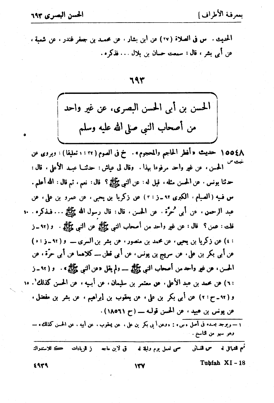 15548 -[خت س] حديث أفطر الحاجم والمحجوم خ في الصوم (32: 1 تعليقاً) ويروى عن الحسن، عن غير واحد مرفوعاً بهذا وقال لي عياش حدثنا عبد الأعلى قال حدثنا يونس، عن الحسن مثله قيل له: عن النبي صَلَّى اللَّهُ عَلَيْهِ وَسَلَّمَ قال: نعم، ثم قال: الله أعلم. س فيه (الصيام، الكبرى 92 - ز: 3) عن زكريا بن يحيى، عن عمرو بن علي، عن عبد الرحمن، عن أبي حُرَّة، عن الحسن قال قال رسول الله صَلَّى اللَّهُ عَلَيْهِ وَسَلَّمَ: ... فذكره قلت: عمن؟ قال: عن غير واحد من أصحاب النبي صَلَّى اللَّهُ عَلَيْهِ وَسَلَّمَ عن النبيّ صَلَّى اللَّهُ عَلَيْهِ وَسَلَّمَ و (92 - ز: 4) عن زكريا بن يحيى، عن محمد بن منصور، عن بشر بن السري - و (92 - ز: 5) عن أبي بكر بن علي، عن سريج بن يونس، عن أبي قطن - كلاهما عن أبي حرّة، عن الحسن، عن غير واحد من أصحاب النبي صَلَّى اللَّهُ عَلَيْهِ وَسَلَّمَ - ولم يقل عن النبيّ صَلَّى اللَّهُ عَلَيْهِ وَسَلَّمَ و (92 - ز: 6) عن محمد بن عبد الأعلى، عن معتمر بن سليمان، عن أبيه، عن الحسن كذلك 1 و (92 - ح: 2) عن أبي بكر بن علي، عن يعقوب بن إبراهيم، عن بشر بن مفضل، عن يونس بن عبيد، عن الحسن قوله - (ح 18561)