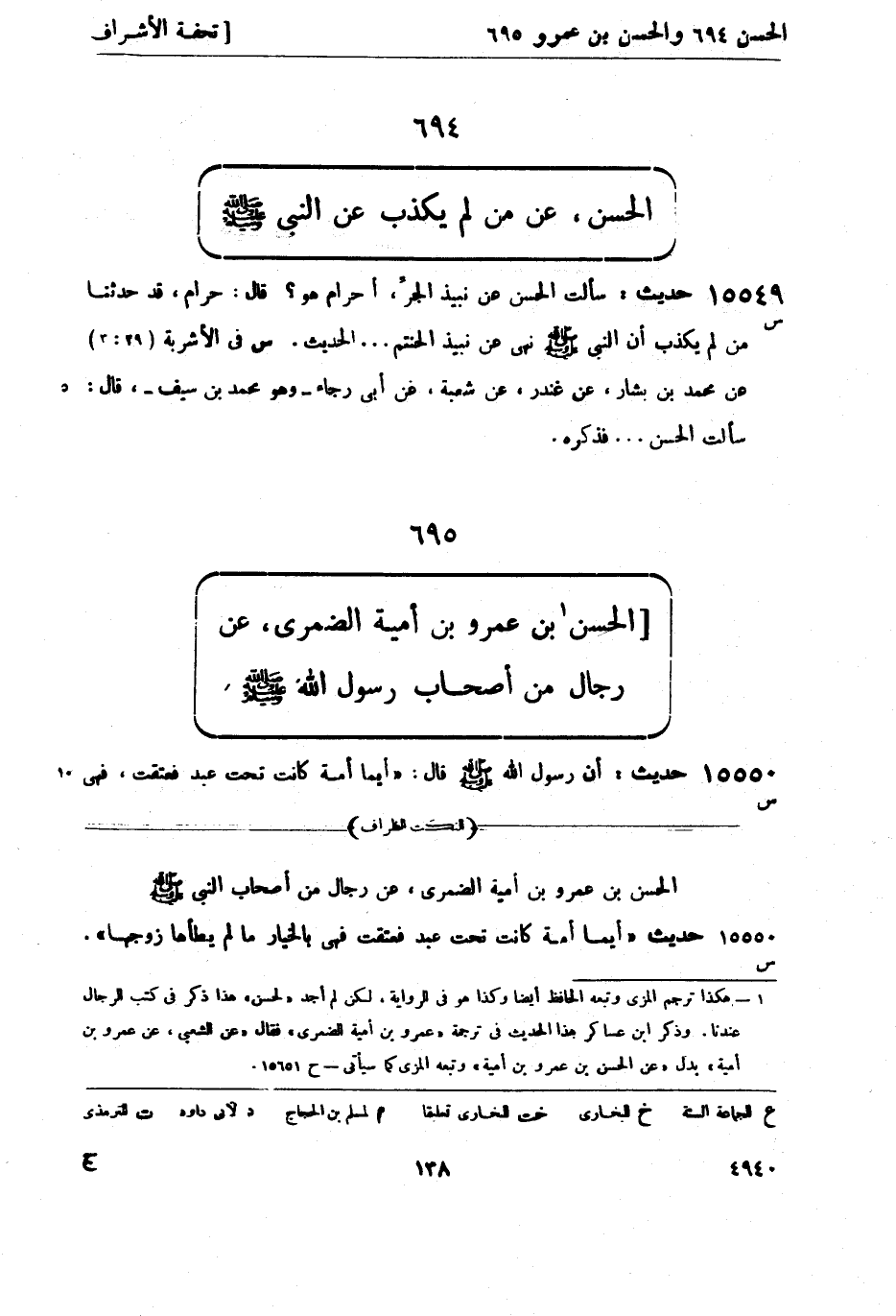 15550 -[س] حديث: أن رسول الله صَلَّى اللَّهُ عَلَيْهِ وَسَلَّمَ قال: أيما أمة كانت تحت عبد فعتقت فهي -[139]- بالخيار ما لم يطأها زوجها. [ك] س في العتق (الكبرى 9: 2) عن أحمد بن عبد الواحد، عن مروان - يعني ابن محمد الطاطري -، عن الليث وذكر آخر قبله، كلاهما عن عبيد الله بن أبي جعفر، عن الحسن بن عمرو بن أمية الضمري أنه حدثه أن رجالاً من أصحاب النبي صَلَّى اللَّهُ عَلَيْهِ وَسَلَّمَ حدثوه بهذا رواه أحمد بن حنبل (في مسنده ج 5 ص 278) عن الحسن بن موسى، عن عبد الله بن لهيعة، عن عبيد الله بن أبي جعفر، عن الفضل بن الحسن بن عمرو بن أمية الضمري قال سمعت رجالاً من أصحاب رسول الله صَلَّى اللَّهُ عَلَيْهِ وَسَلَّمَ نحوه. ورواه أيضاً (المسند ج 5 ص 378) عن يحيى بن إسحاق، عن ابن لهيعة، عن عبيد الله بن أبي جعفر، عن الفضل بن الحسن، عن أبيه قال سمعت رجالاً من أصحابه ... فذكر مثله - ولم يقل تحت عبد ك في رواية ابن الأحمر ولم يذكره أبو القاسم [