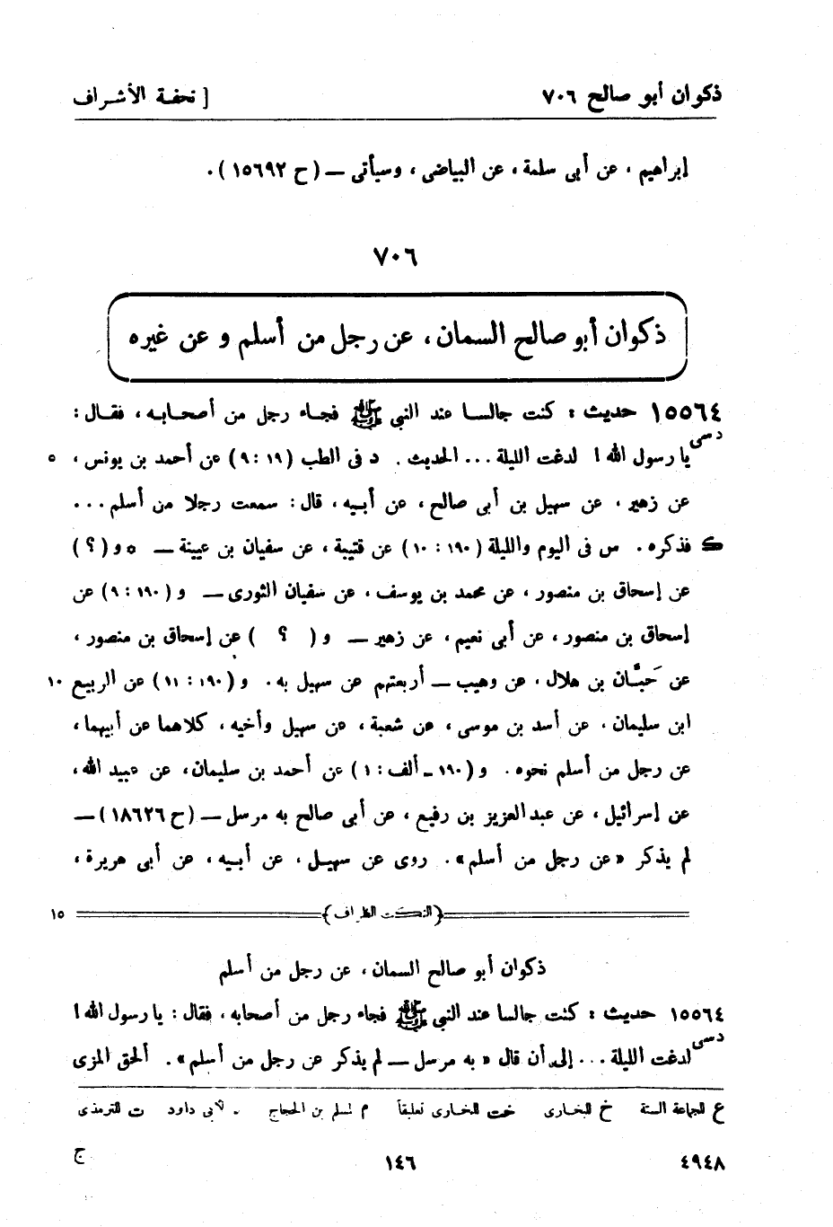15563 -[د سي] حديث: كنت جالساً عند النبي صَلَّى اللَّهُ عَلَيْهِ وَسَلَّمَ فجاء رجل من أصحابه فقال يا رسول الله! لدغت الليلة ... الحديث. د في الطب (19: 9) عن أحمد بن يونس، عن زهير، عن سهيل بن أبي صالح، عن أبيه قال سمعت رجلاً من أسلم ... فذكره س في اليوم والليلة (190: 10) عن قتيبة، عن سفيان بن عيينة - ك و (؟) عن إسحاق بن منصور، عن محمد بن يوسف، عن سفيان الثوري - و (190: 9) عن إسحاق بن منصور، عن أبي نعيم، عن زهير - و (؟) عن إسحاق بن منصور، عن حَبَّان بن هلال، عن وهيب - أربعتهم عن سهيل به. و (190: 11) عن الربيع بن سليمان، عن أسد بن موسى، عن شعبة، عن سهيل وأخيه، كلاهما عن أبيهما، عن رجل من أسلم نحوه. و (190 ألف: 1) عن أحمد بن سليمان، عن عبيد الله، عن إسرائيل، عن عبد العزيز بن رفيع، عن أبي صالح به مرسل - (ح 18626) - لم يذكر عن رجل من أسلم روى عن سهيل، عن أبيه، عن أبي هريرة -[147]- وقد مضى - (ح 12622 - 12662، 12735، 12745) [ك حديث سفيان الثوري في رواية ابن الأحمر ولم يذكره أبو القاسم] .