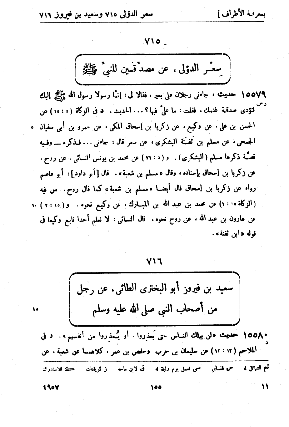 15578 -[د س] حديث: جاءني رجلان على بعير فقالا لي إنَّا رسولا رسول الله صَلَّى اللَّهُ عَلَيْهِ وَسَلَّمَ إليك لتؤدي صدقة غنمك فقلت: ما عليَّ فيها؟ ... الحديث. د في الزكاة (5: 15) عن الحسن بن علي، عن وكيع، عن زكريا بن إسحاق المكي، عن عمرو بن أبي سفيان الجمحي، عن مسلم بن ثَفنَة اليشكري، عن سعر قال جاءني ... فذكره - وفيه قصَّة ذكرها مسلم (اليشكري) و (5: 16) عن محمد بن يونس النسائي، عن روح، عن زكريا بن إسحاق بإسناده وقال: مسلم بن شعبة قال [أبو داود] أبو عاصم رواه، عن زكريا بن إسحاق قال أيضاً مسلم بن شعبة كما قال روح س فيه (الزكاة 15: 1) عن محمد بن عبد الله بن المبارك، عن وكيع نحوه. و (15: 2) ، عن هارون بن عبد الله، عن روح نحوه. قال النسائي لا نعلم أحداً تابع وكيعاً في قوله ابن ثفنة.