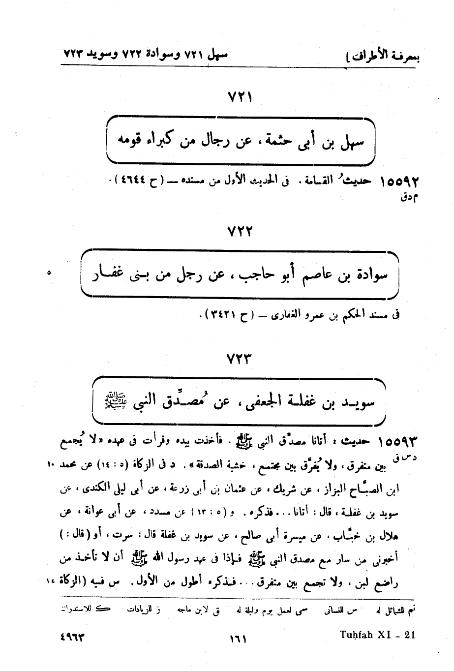 15593 -[د س ق] حديث: أتانا مصدِّق النبيّ صَلَّى اللَّهُ عَلَيْهِ وَسَلَّمَ فأخذت بيده وقرأت في عهده لا يُجمع بين متفرق ولا يُفرَّق بين مجتمع خشية الصدقة. د في الزكاة (5: 14) عن محمد بن الصبَّاح البزاز، عن شريك، عن عثمان بن أبي زرعة، عن أبي ليلى الكندي، عن سويد بن غفلة قال أتانا ... فذكره و (5: 13) عن مسدد، عن أبي عوانة، عن هلال بن خبَّاب، عن ميسرة أبي صالح، عن سويد بن غفلة قال سرت أو (قال) أخبرني من سار مع مصدق النبي صَلَّى اللَّهُ عَلَيْهِ وَسَلَّمَ فإذا في عهد رسول الله صَلَّى اللَّهُ عَلَيْهِ وَسَلَّمَ أن لا تأخذ من راضع لبن ولا تجمع بين متفرق ... فذكره أطول من الأول س فيه (الزكاة -[162]-) (12: 1) ، عن هناد بن السري، عن هشيم، عن هلال بن خباب، عن ميسرة أبي صالح، عن سويد بن غفلة قال: أتانا مصدق النبي صَلَّى اللَّهُ عَلَيْهِ وَسَلَّمَ فأتيته فجلست إليه ... فذكر الحديث. ق فيه (الزكاة 11: 1) عن علي بن محمد، عن وكيع، عن شريك، عن عثمان الثقفي، عن أبي ليلى الكندي، عن سويد بن غفلة قال جاءنا مصدق النبيّ صَلَّى اللَّهُ عَلَيْهِ وَسَلَّمَ...... فذكر نحوه.