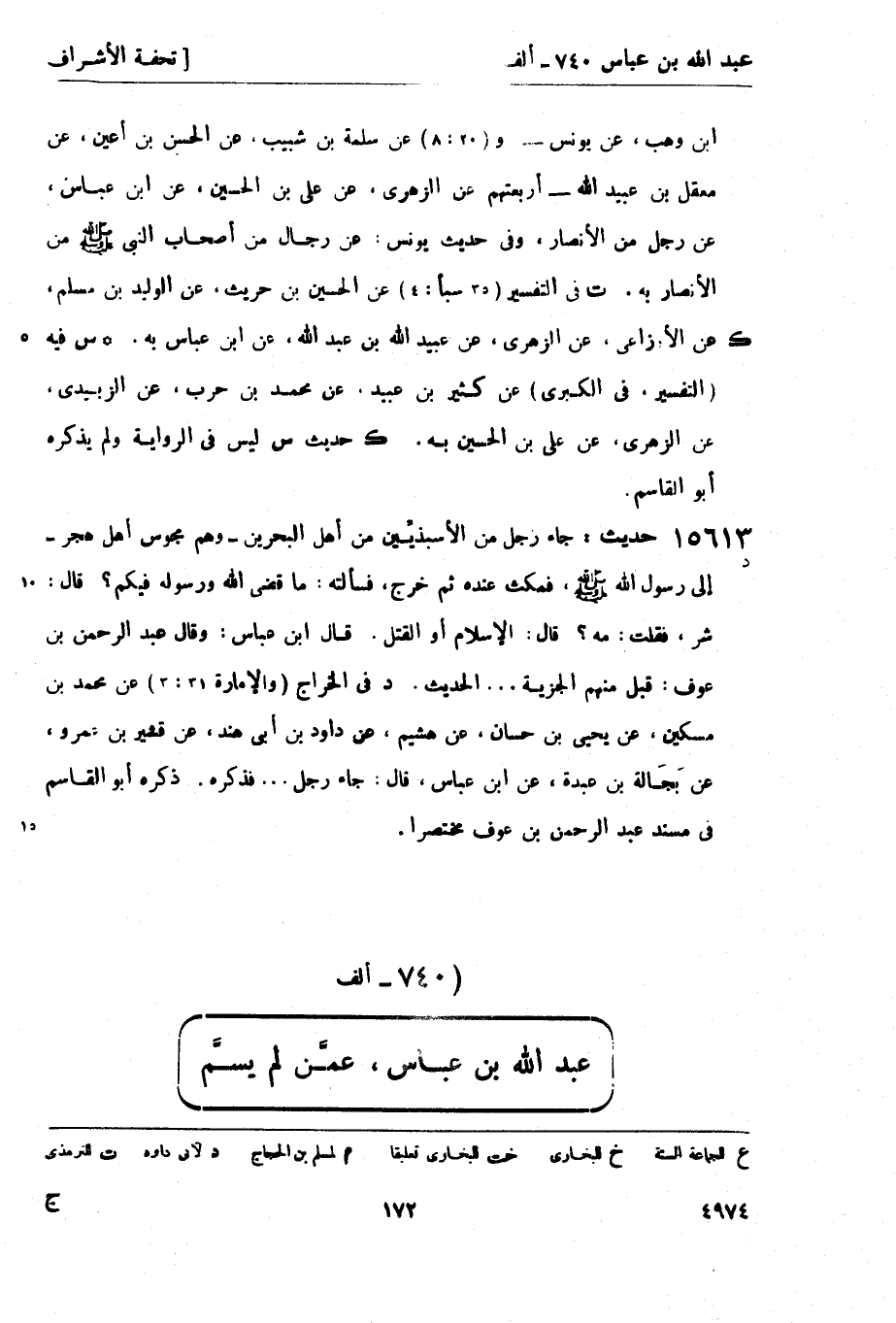 15613 -[د] حديث: جاء رجل من الأسبذيِّين من أهل البحرين - وهم مجوس أهل هجر - إلى رسول الله صَلَّى اللَّهُ عَلَيْهِ وَسَلَّمَ فمكث عنده ثم خرج، فسألته: ما قضى الله ورسوله فيكم؟ قال شر فقلت: مه؟ قال الإسلام أو القتل قال ابن عباس وقال عبد الرحمن بن عوف قبل منهم الجزية ... الحديث. د في الخراج (والإمارة 31: 3) عن محمد بن مسكين، عن يحيى بن حسان، عن هشيم، عن داود بن أبي هند، عن قشير بن عمرو، عن بَجَالة بن عبدة، عن ابن عباس قال جاء رجل ... فذكره ذكره أبو القاسم في مسند عبد الرحمن بن عوف مختصراً (740 - ألف عبد الله بن عباس عمَّن لم يسمَّ.