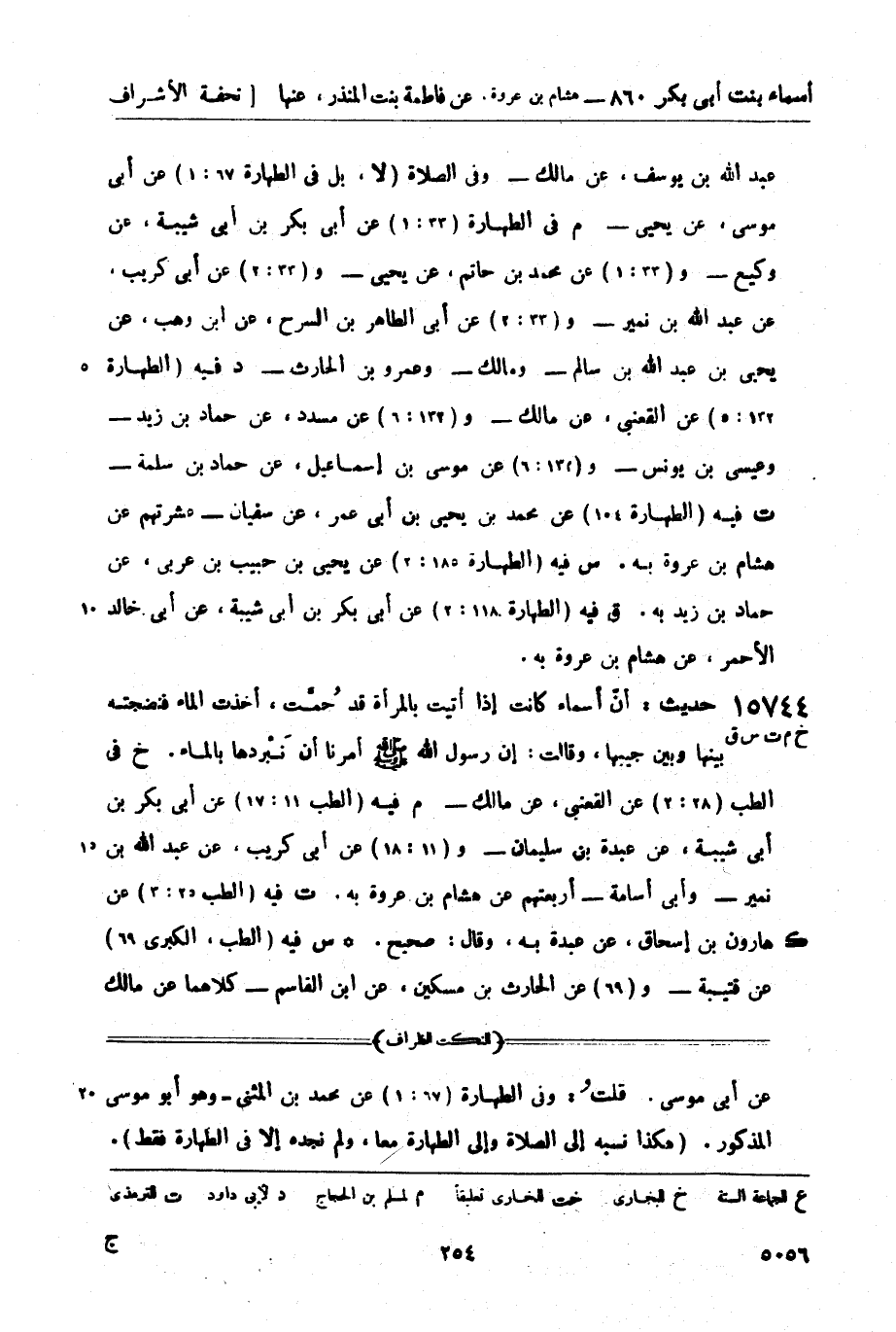 15744 -[خ م ت س ق] حديث: أنّ أسماء كانت إذا أُتيت بالمرأة قد حُمَّت أخذت الماء فنضجته بينها وبين جيبها وقالت: إن رسول الله صَلَّى اللَّهُ عَلَيْهِ وَسَلَّمَ أمرنا أن نَبْردها بالماء. خ في الطب (28: 2) عن القعنبي، عن مالك - م فيه (الطب 11: 17) عن أبي بكر بن أبي شيبة، عن عبدة بن سليمان و (11: 18) عن أبي كريب، عن عبد الله بن نمير - وأبي أسامة - أربعتهم عن هشام بن عروة به. ت فيه (الطب 25: 3) عن هارون بن إسحاق، عن عبدة به. وقال: صحيح ك س فيه (الطب، الكبرى 69) عن قتيبة - و (69) عن الحارث بن مسكين، عن ابن القاسم - كلاهما عن مالك -[255]- به. ق فيه (الطب 19: 4) عن أبي بكر بن أبي شيبة به. ك حديث س ليس في الرواية ولم يذكره أبو القاسم.