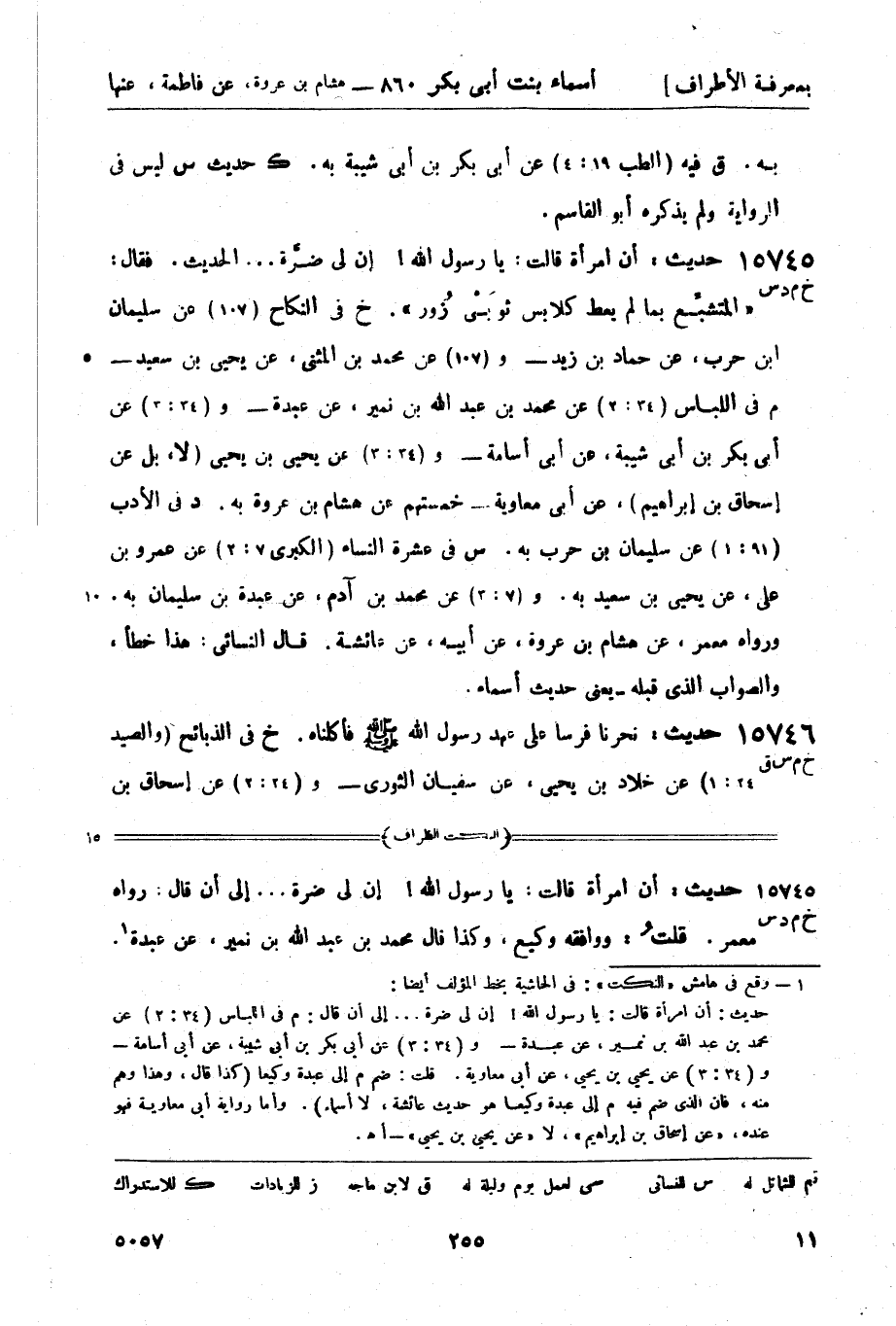 15745 -[خ م د س] حديث: أن امرأة قالت: يا رسول الله! إن لي ضرَّة ... الحديث. فقال: المتشبِّع بما لم يعط كلابس ثوبَيْ زُور. خ في النكاح (107) عن سليمان بن حرب، عن حماد بن زيد - و (107) عن محمد بن المثنى، عن يحيى بن سعيد - م في اللباس (34: 2) عن محمد بن عبد الله بن نمير، عن عبدة - و (34: 3) عن أبي بكر بن أبي شيبة، عن أبي أسامة - و (34: 3) عن يحيى بن يحيى (لا بل، عن إسحاق بن إبراهيم) عن أبي معاوية - خمستهم عن هشام بن عروة به. د في الأدب (91: 1) عن سليمان بن حرب به. س في عشرة النساء (الكبرى 7: 2) عن عمرو بن علي، عن يحيى بن سعيد به. و (7: 3) عن محمد بن آدم، عن عبدة بن سليمان به. ورواه معمر، عن هشام بن عروة، عن أبيه، عن عائشة قال النسائي هذا خطأ والصواب الذي قبله - يعني حديث أسماء.