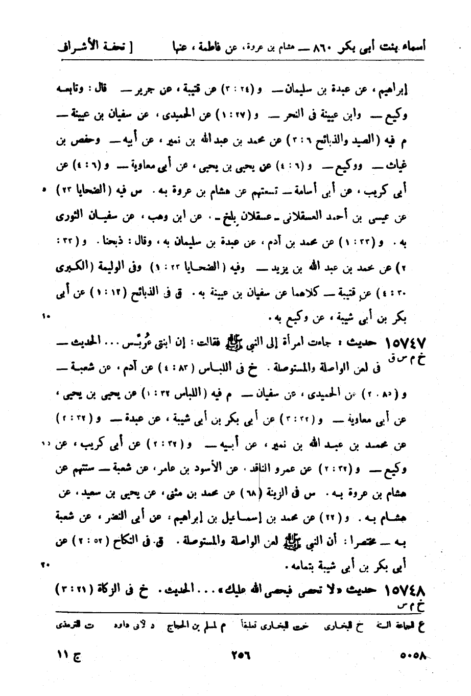 15748 -[خ م س] حديث لا تحصي فيحصي الله عليك ... الحديث. خ في الزكاة -[257]- (21: 3) عن صدقة بن الفضل و (21: 4) عثمان بن أبي شيبة (- فرقهما) ، كلاهما عن عبدة بن سليمان - وفي الهبة (14: 2) عن عبيد الله بن سعيد، عن عبد الله بن نمير - م في الزكاة (29: 1) عن أبي بكر بن أبي شيبة، عن حفص بن غياث - ثلاثتهم عن هشام بن عروة به. س فيه (الزكاة 62: 2) عن محمد بن آدم وفي عشرة النساء (الكبرى 73: 3) عن هناد، كلاهما عن عبدة بن سليمان به - وبعضهم يزيد على بعض في الحديث وباقي طرقه في ترجمة عباد بن حمزة، عن أسماء - (ح 15713) .