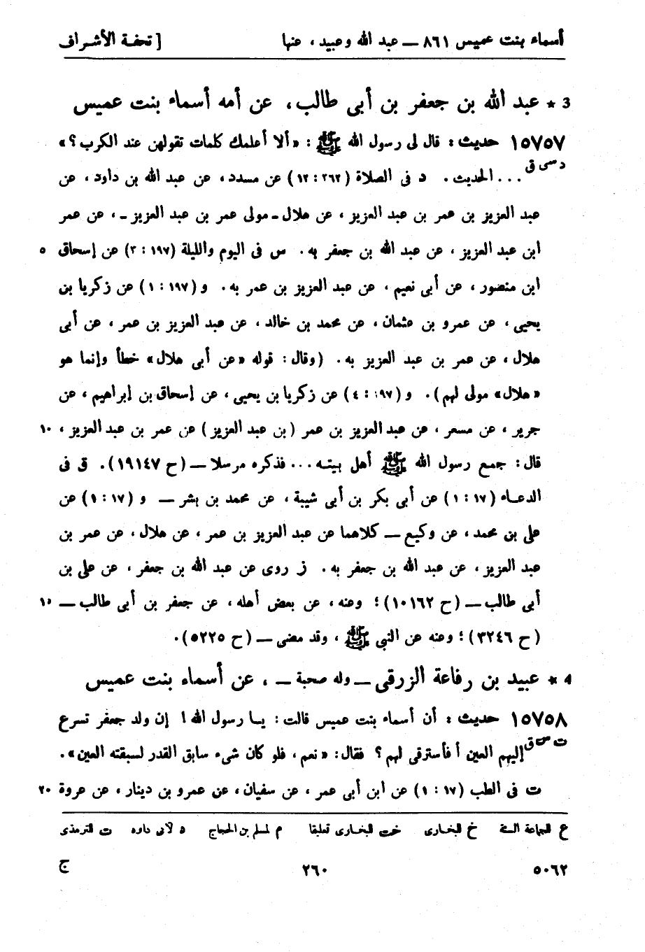 15758 -[ت س ق] حديث: أن أسماء بنت عميس قالت: يا رسول الله! إن ولد جعفر تسرع إليهم العين أفأسترقي لهم؟ فقال: نعم فلو كان شيء سابق القدر لسبقته العين. ت في الطب (17: 1) عن ابن أبي عمر، عن سفيان، عن عمرو بن دينار، عن عروة -[261]- بن عامر، عن عبيد بن رفاعة الزرقي به. وقال: حسن صحيح. قال ورُوي هذا، عن أيوب، عن عمرو بن دينار، عن عروة بن عامر، عن عبيد بن رفاعة، عن أسماء بنت عميس عن النبيّ صَلَّى اللَّهُ عَلَيْهِ وَسَلَّمَ حدثنا بذلك (17: 2) الحسن بن علي الخلال حدثنا عبد الرزاق، عن معمر، عن أيوب بهذا ك س فيه (الطب، الكبرى 35: 2) عن أحمد بن الأزهر، عن عبد الرزاق به. ق فيه (الطب 33: 1) عن أبي بكر بن أبي شيبة، عن سفيان بن عيينة به. ك حديث س ليس في الرواية ولم يذكره أبو القاسم وذكر حديث ق في مسند عبيد بن رفاعة عن النبي صَلَّى اللَّهُ عَلَيْهِ وَسَلَّمَ - (ح 9745) .