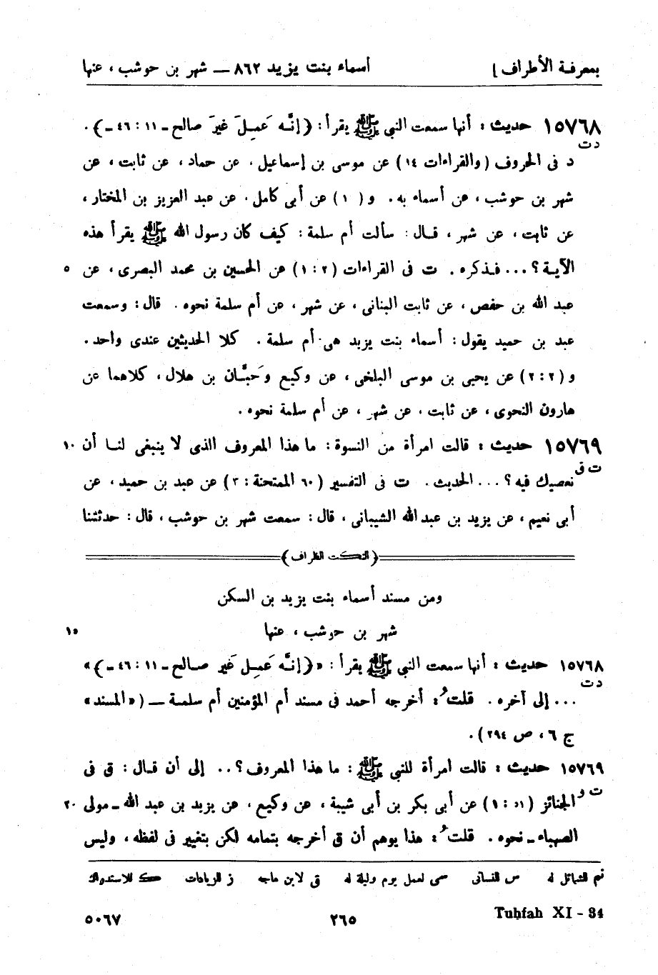 15768 -[د ت] حديث: أنها سمعت النبي صَلَّى اللَّهُ عَلَيْهِ وَسَلَّمَ يقرأ إنَّه عمل غير صالح (11: 46) . د في الحروف (والقراءات 14) عن موسى بن إسماعيل، عن حماد، عن ثابت، عن شهر بن حوشب، عن أسماء به. و (1) عن أبي كامل، عن عبد العزيز بن المختار، عن ثابت، عن شهر قال سألت أم سلمة كيف كان رسول الله صَلَّى اللَّهُ عَلَيْهِ وَسَلَّمَ يقرأ هذه الآية؟ ... فذكره ت في القراءات (2: 1) عن الحسين بن محمد البصري، عن عبد الله بن حفص، عن ثابت البناني، عن شهر، عن أم سلمة نحوه. قال: وسمعت عبد بن حميد يقول: أسماء بنت يزيد هي أم سلمة كلا الحديثين عندي واحد و (2: 2) عن يحيى بن موسى البلخي، عن وكيع وحَبَّان بن هلال، كلاهما عن هارون النحوي، عن ثابت، عن شهر، عن أم سلمة نحوه.