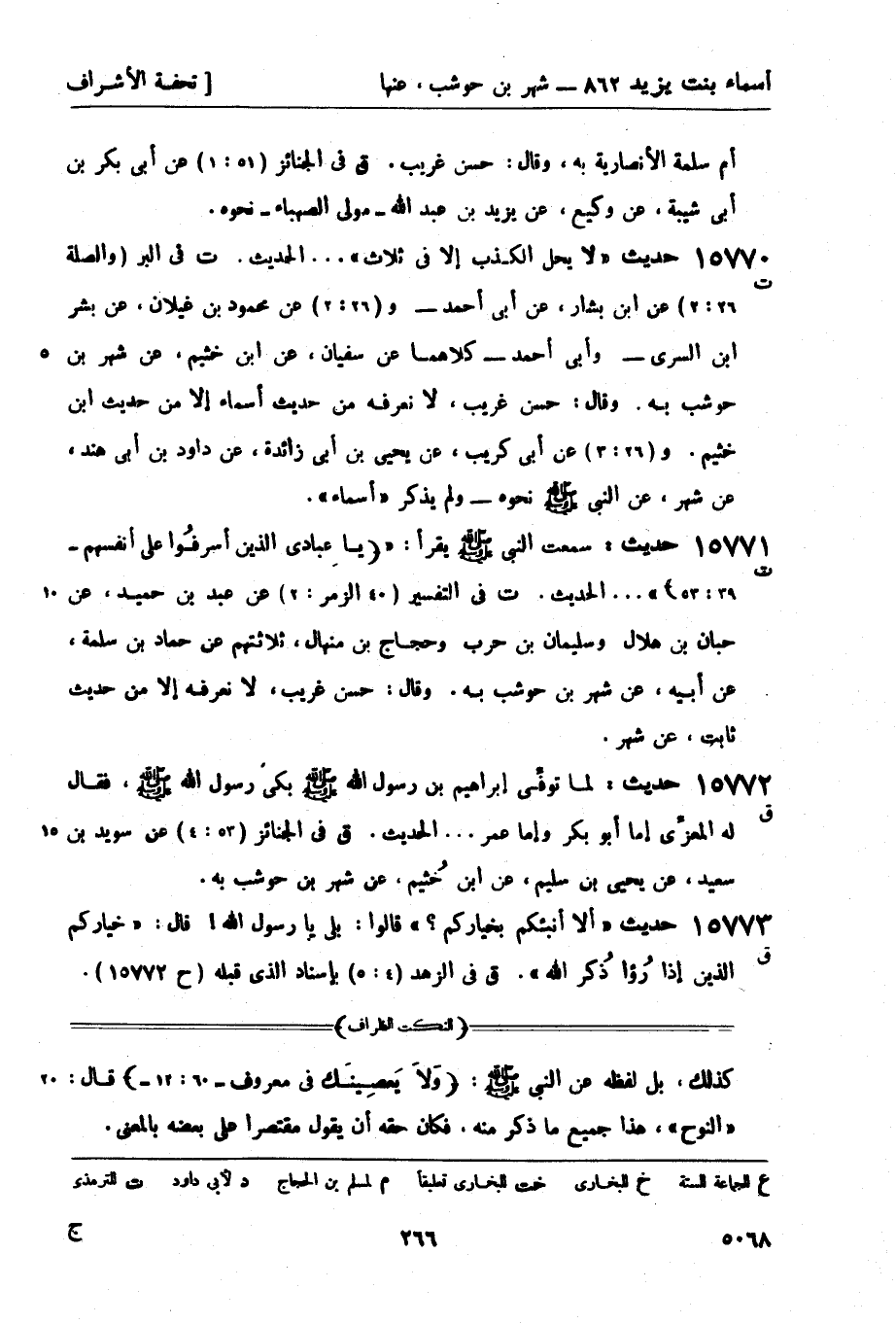 15770 -[ت] حديث لا يحل الكذب إلا في ثلاث ... الحديث. ت في البر (والصلة 26: 2) عن ابن بشار، عن أبي أحمد - و (26: 2) عن محمود بن غيلان، عن بشر بن السري - وأبي أحمد - كلاهما عن سفيان، عن ابن خثيم، عن شهر بن حوشب به. وقال: حسن غريب لا نعرفه من حديث أسماء إلا من حديث ابن خثيم و (26: 3) عن أبي كريب، عن يحيى بن أبي زائدة، عن داود بن أبي هند، عن شهر عن النبي صَلَّى اللَّهُ عَلَيْهِ وَسَلَّمَ نحوه - ولم يذكر أسماء.