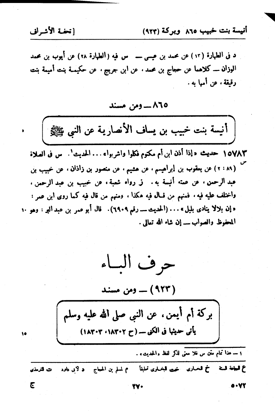 - ومن مسند بركة أم أيمن عن النبي صَلَّى اللَّهُ عَلَيْهِ وَسَلَّمَ يأتي حديثها في الكنى - (ح 18302، 18303)