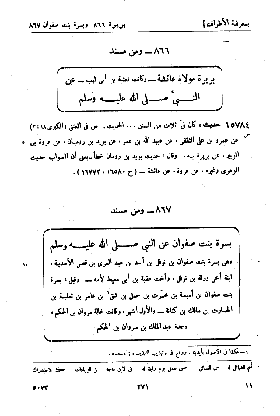 - ومن مسند بسرة بنت صفوان عن النبي صَلَّى اللَّهُ عَلَيْهِ وَسَلَّمَ وهي بسرة بنت صفوان بن نوفل بن أسد بن عبد العزى بن قصي الأسدية ابنة أخي ورقة بن نوفل وأخت عقبة بن أبي معيط لأمه - وقيل بسرة بنت صفوان بن أمية بن محرث بن حمل بن شق بن عامر بن ثعلبة بن الحارث بن مالك بن كنانة - والأول أشهر وكانت خالة مروان بن الحكم وجدة عبد الملك بن مروان بن الحكم.