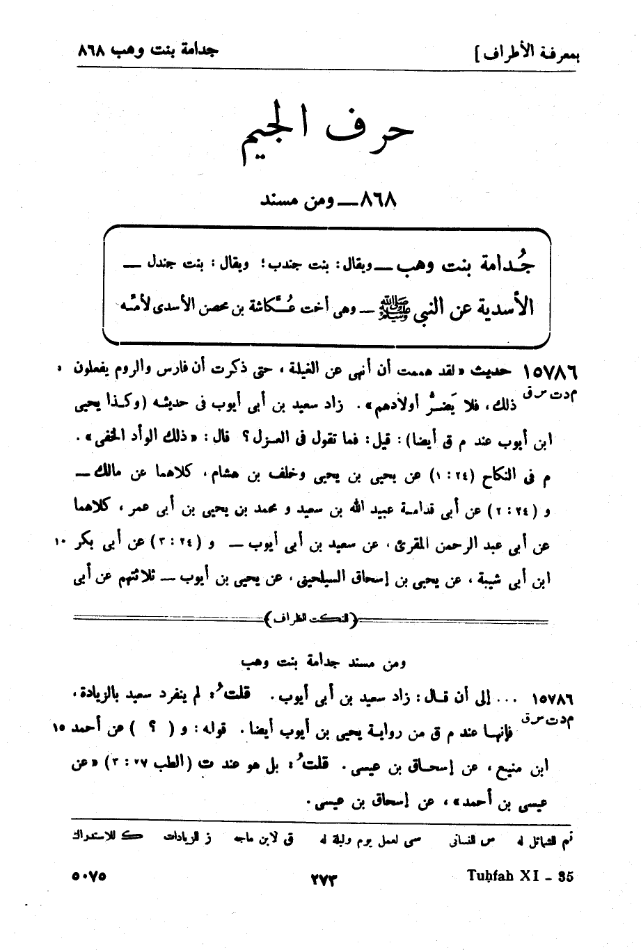 - ومن مسند جُدامة بنت وهب -؛ ويقال: بنت جندب ويقال: بنت جندل - الأسدية عن النبي صَلَّى اللَّهُ عَلَيْهِ وَسَلَّمَ - وهي أخت عُكَّاشة بن محصن الأسدي لأمِّه.