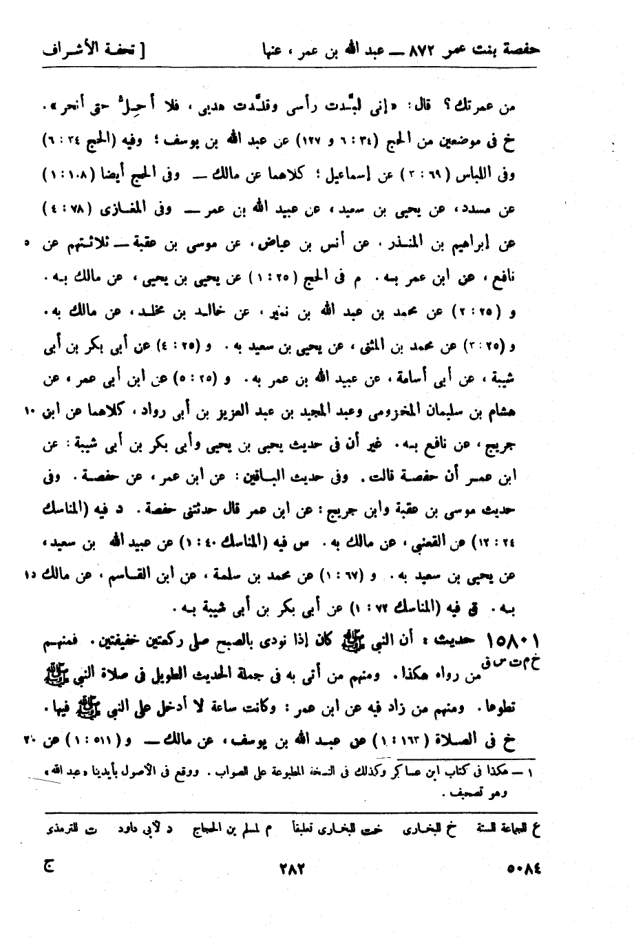 15801 -[خ م ت س ق] حديث: أن النبي صَلَّى اللَّهُ عَلَيْهِ وَسَلَّمَ كان إذا نودي بالصبح صلى ركعتين خفيفتين. فمنهم من رواه هكذا. ومنهم من أتى في جملة الحديث الطويل في صلاة النبي صَلَّى اللَّهُ عَلَيْهِ وَسَلَّمَ تطوعاً ومنهم من زاد فيه عن ابن عمر: وكانت ساعة لا أدخل على النبي صَلَّى اللَّهُ عَلَيْهِ وَسَلَّمَ فيها. خ في الصلاة (163: 1) عن عبد الله بن يوسف، عن مالك - و (511: 1) عن -[283]- سليمان بن حرب، عن حماد بن زيد، عن أيوب - و (506) عن مسدد، عن يحيى بن سعيد، عن عبيد الله بن عمر - ثلاثتهم عن نافع، عن عبد الله بن عمر (به) م فيه (الصلاة 122: 1) عن يحيى بن يحيى، عن مالك به. و (122: 2) عن قتيبة ومحمد بن رمح (ويحيى بن يحيى) كلاهما (بل ثلاثتهم) عن ليث، عن نافع به. و (122: 2) عن زهير بن حرب، وعبيد الله بن سعيد، كلاهما عن يحيى بن سعيد به. و (122: 2) عن زهير بن حرب، عن إسماعيل ابن علية، عن أيوب به. و (122: 3) عن أحمد بن عبد الله بن الحكم، عن غندر - و (122: 4) عن إسحاق بن إبراهيم، عن النضر بن شميل - كلاهما عن شعبة، عن زيد بن محمد، عن نافع به. و (122: 5) عن محمد بن عباد المكي، عن سفيان بن عيينة، عن عمرو بن دينار، عن الزهري، عن سالم، عن ابن عمر به. ت فيه (الصلاة 204: 2) عن الحسن بن علي، عن عبد الرزاق، عن معمر، عن أيوب به. وفي الشمائل (41: 24) عن أحمد بن منيع، عن إسماعيل ابن علية به. ك و (41: 25) عن قتيبة، عن مروان بن معاوية، عن جعفر بن برقان، عن ميمون بن مهران، عن ابن عمر قال وحدثتني حفصة بركعتي الغداة ولم أكن أُراهما من النبيّ صَلَّى اللَّهُ عَلَيْهِ وَسَلَّمَ س في الصلاة (738: 12) عن أحمد بن عبد الله بن الحكم به. و (735: 1 و38: 13) عن قتيبة، عن ليث به. و (735: 2) عن محمد بن منصور و (738: 15) الحسين بن عيسى (- فرقهما) ، كلاهما عن سفيان به. -[284]- و (738: 3) عن إسحاق بن منصور، عن يحيى بن سعيد و (738: 2) عن شعيب بن شعيب بن إسحاق، عن عبد الوهاب بن سعيد، عن شعيب بن إسحاق، كلاهما عن الأوزاعي - (738: 5) عن إسحاق بن منصور، عن معاذ بن هشام، عن أبيه - كلاهما عن يحيى بن أبي كثير، عن نافع به. و (738: 4) عن هشام بن عمار، عن يحيى بن حمزة، عن الأوزاعي، عن يحيى بن أبي كثير، عن أبي سلمة بن عبد الرحمن ونافع، كلاهما عن ابن عمر به. و (738: 6) عن يحيى بن محمد بن السكن، عن محمد بن جهضم، عن إسماعيل بن جعفر، عن عمر بن نافع، عن أبيه به. و (738: 7) عن محمد بن عبد الله بن عبد الحكم، عن إسحاق بن الفرات، عن يحيى بن أيوب، عن يحيى بن سعيد - و (738: 8) عن عبد الله بن إسحاق، عن أبي عاصم، عن ابن جريج، عن موسى بن عقبة - و (738: 11) عن محمد بن عبد الله بن يزيد، عن أبيه، عن جويرية بن أسماء - ثلاثتهم عن نافع به. و (738: 9) عن محمد بن سلمة، عن ابن القاسم، عن مالك به. و (738: 10) عن إسماعيل بن مسعود، عن خالد بن الحارث، عن عبيد الله بن عمر به. و (738: 14) عن إسحاق بن إبراهيم، عن عبد الرزاق به - والألفاظ مختلفة ق فيه (الصلاة 140: 3) عن محمد بن رمح به. رواه عبد الحميد بن جعفر، عن نافع، عن صفية بنت أبي عبيد، عن حفصة وسيأتي - (15819) ك حديث قتيبة، عن مروان بن معاوية لم يذكره أبو القاسم وهو في السماع.