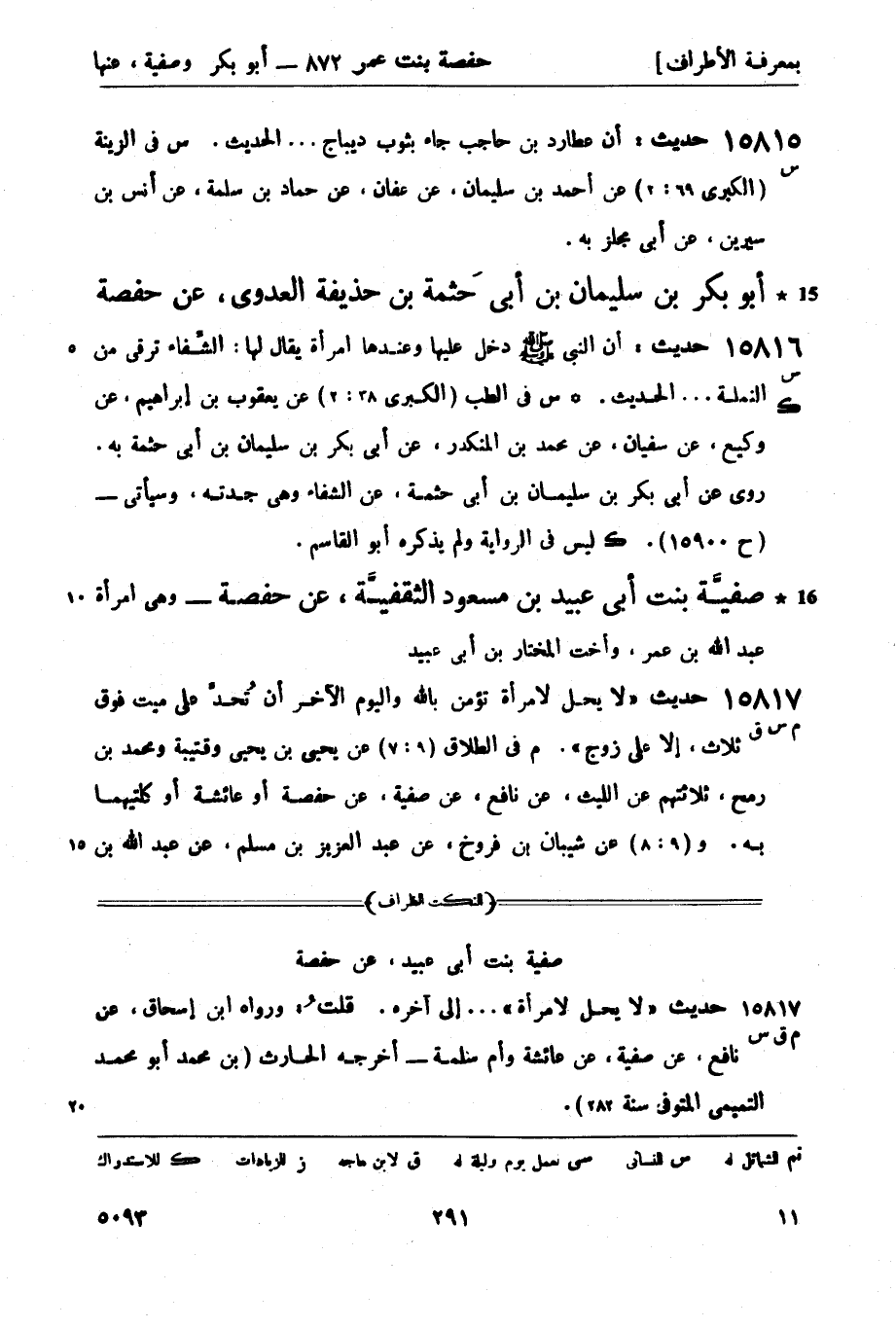 15817 -[م س ق] حديث لا يحل لامرأة تؤمن بالله واليوم الآخر أن تُحدَّ على ميت فوق ثلاث، إلا على زوج. م في الطلاق (9: 7) عن يحيى بن يحيى وقتيبة ومحمد بن رمح، ثلاثتهم عن الليث، عن نافع، عن صفية، عن حفصة أو عائشة أو كلتيهما به. و (9: 8) عن شيبان بن فروخ، عن عبد العزيز بن مسلم، عن عبد الله بن -[292]- دينار، عن نافع بإسناد الليث مثل روايته. و (9: 9) عن أبي غسان المسمعي وأبي موسى، كلاهما عن عبد الوهاب الثقفي، عن يحيى بن سعيد، عن نافع، عن صفيّة، عن حفصة عن النبي صَلَّى اللَّهُ عَلَيْهِ وَسَلَّمَ بمثله. و (9: 10) عن أبي الربيع الزهراني، عن حماد بن زيد، عن أيوب - و (9: 10) عن محمد بن عبد الله بن نمير، عن أبيه، عن عبيد الله بن عمر - كلاهما عن نافع، عن صفية، عن بعض أزواج النبي صَلَّى اللَّهُ عَلَيْهِ وَسَلَّمَ عن النبي صَلَّى اللَّهُ عَلَيْهِ وَسَلَّمَ به. من س فيه (الطلاق 55: 4) عن محمد بن بشار، عن الثقفي به. ق فيه (الطلاق 35: 2) عن هناد بن السري، عن أبي الأحوص، عن يحيى بن سعيد به. ز رواه فليح بن سليمان، عن نافع، عن صفية، عن عائشة وحفصة. ورواه مالك (في الموطأ في الطلاق 35: 4) عن نافع، عن صفية، عن عائشة أو حفصة.