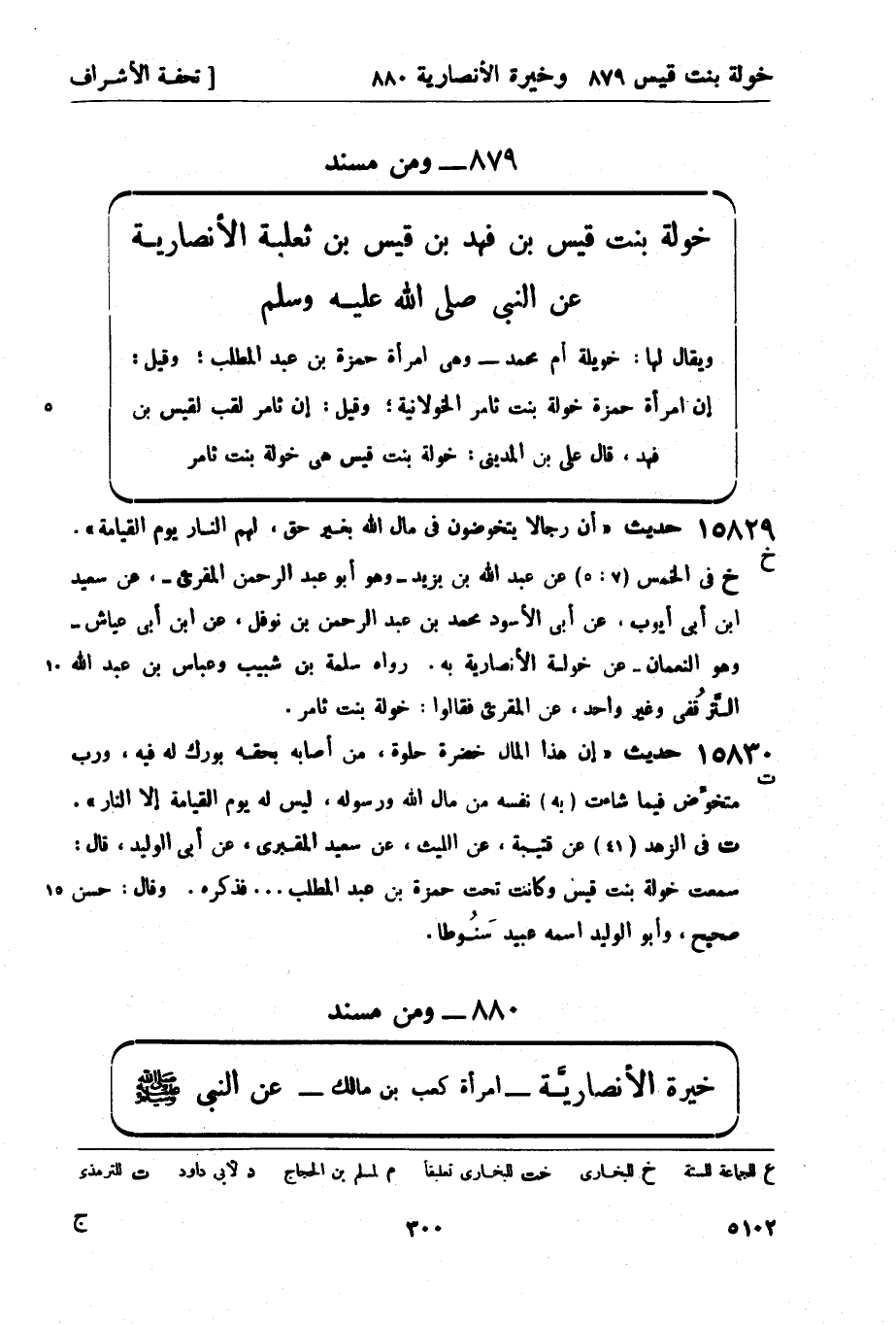 15829 -[خ] حديث أن رجالاً يتخوضون في مال الله بغير حق، لهم النار يوم القيامة. خ في الخمس (7: 5) عن عبد الله بن يزيد - وهو أبو عبد الرحمن المقرئ -، عن سعيد بن أبي أيوب، عن أبي الأسود محمد بن عبد الرحمن بن نوفل، عن ابن أبي عياش - وهو النعمان - عن خولة الأنصارية به. رواه سلمة بن شبيب وعباس بن عبد الله التَّرقُفي وغير واحد، عن المقرئ فقالوا: خولة بنت ثامر.