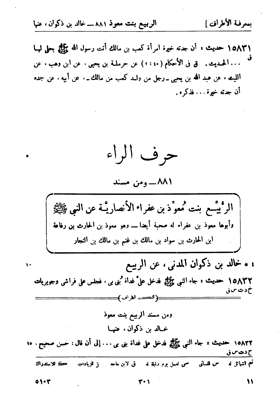- ومن مسند الرُّبِّيع بنت مُعوِّذ بن عفراء الأنصاريَّة عن النبي صَلَّى اللَّهُ عَلَيْهِ وَسَلَّمَ وأبوها معوذ بن عفراء له صحبة أيضاً - وهو معوذ بن الحارث بن رفاعة بن الحارث بن سواد بن مالك بن غنم بن مالك بن النجار.