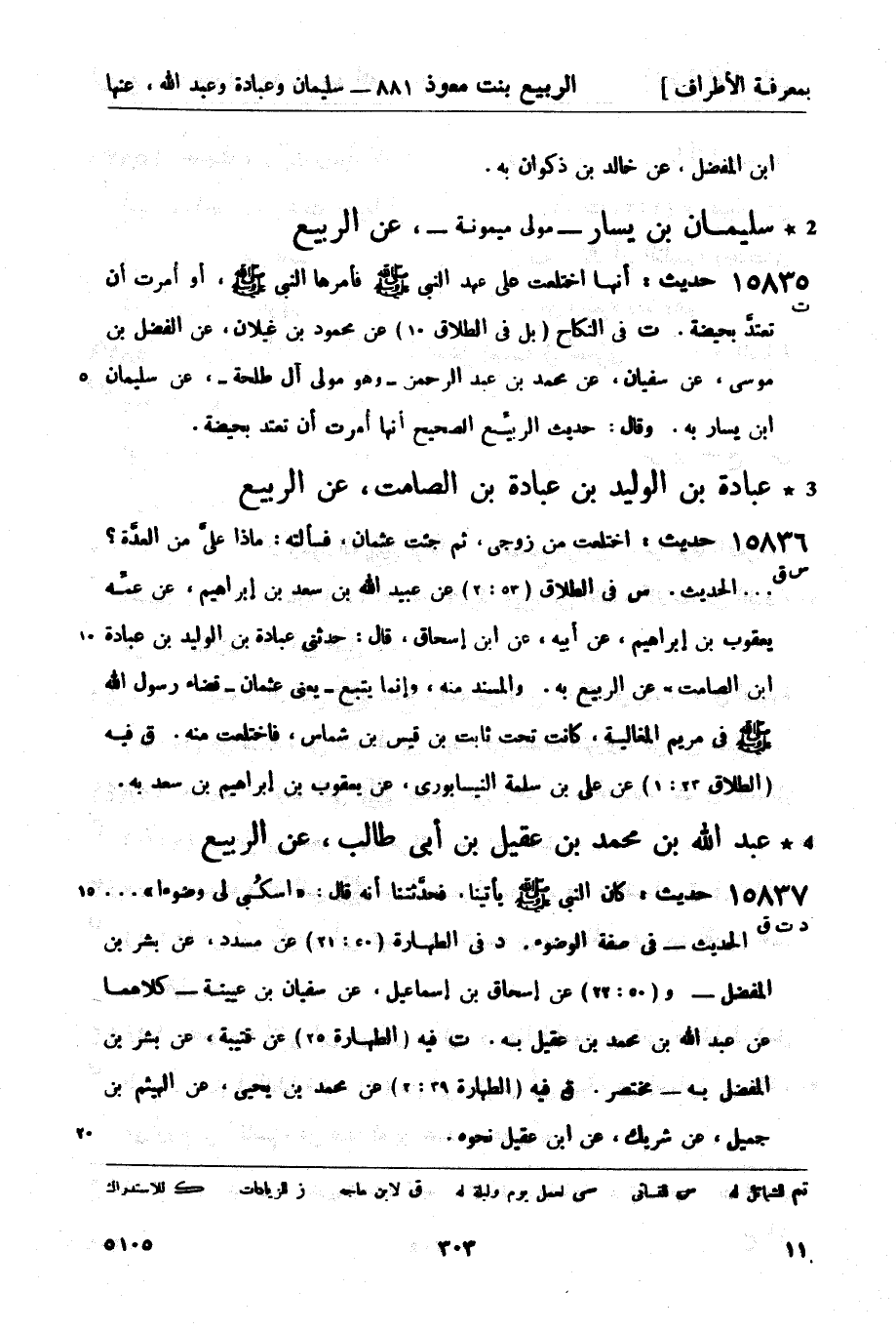 15835 -[ت] حديث: أنها اختلعت على عهد النبي صَلَّى اللَّهُ عَلَيْهِ وَسَلَّمَ فأمرها النبي صَلَّى اللَّهُ عَلَيْهِ وَسَلَّمَ، أو أُمرت أن تعتدَّ بحيضة. ت في النكاح (بل في الطلاق 10) عن محمود بن غيلان، عن الفضل بن موسى، عن سفيان، عن محمد بن عبد الرحمن - وهو مولى آل طلحة -، عن سليمان بن يسار به. وقال: حديث الربيِّع أنها أُمرت أن تعتد بحيضة.