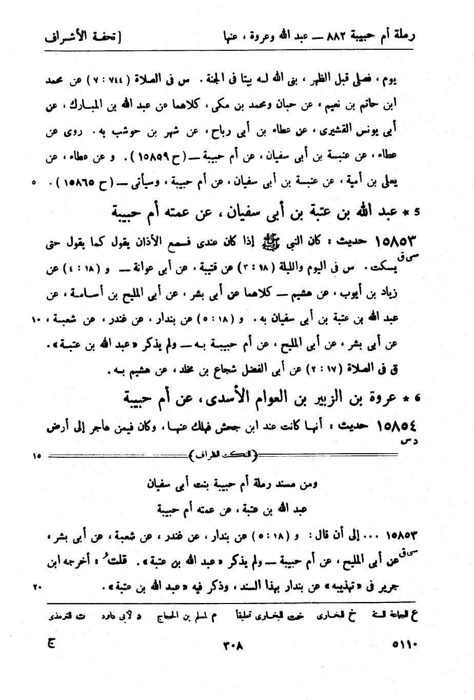 15853 -[سي ق] حديث: كان النبي صَلَّى اللَّهُ عَلَيْهِ وَسَلَّمَ إذا كان عندي فسمع الأذان يقول كما يقول حتى يسكت. س في اليوم والليلة (18: 3) عن قتيبة، عن أبي عوانة - و (18: 4) ، عن زياد بن أيوب، عن هشيم - كلاهما عن أبي بشر، عن أبي المليح بن أسامة، عن عبد الله بن عتبة بن أبي سفيان به. (18: 5) عن بندار، عن غندر، عن شعبة، عن أبي بشر، عن أبي المليح، عن أم حبيبة به - ولم يذكر عبد الله بن عتبة. ق في الصلاة (17: 2) عن أبي الفضل شجاع بن مخلد، عن هشيم به.