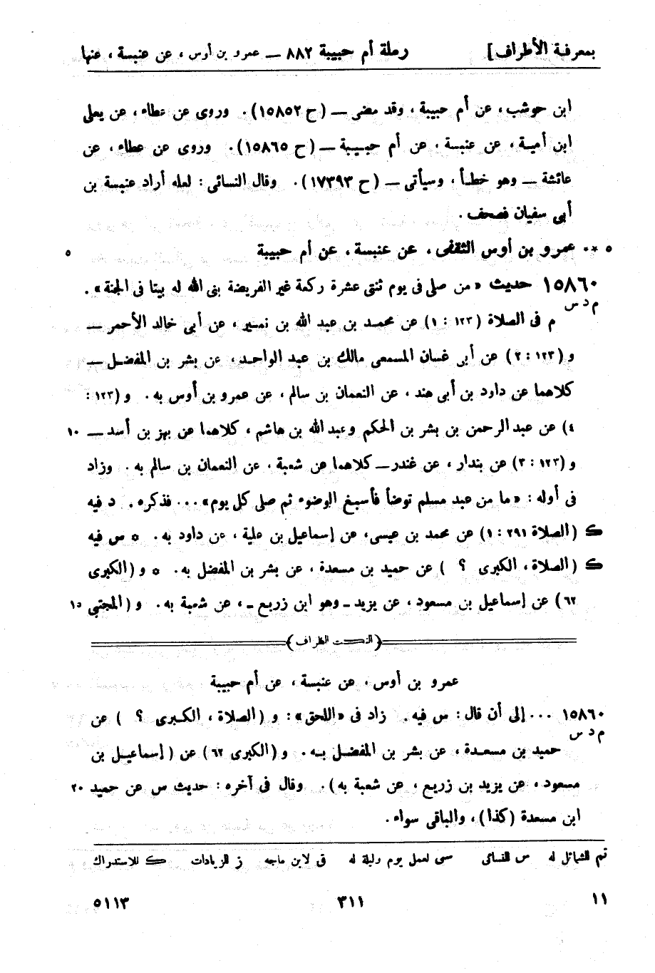 15860 -[م د س] حديث من صلى في يوم ثنتي عشرة ركعة غير الفريضة بنى الله له بيتاً في الجنة. م في الصلاة (123: 1) عن محمد بن عبد الله بن نمير، عن أبي خالد الأحمر - و (123: 2) عن أبي غسان المسمعي مالك بن عبد الواحد، عن بشر بن المفضل - كلاهما عن داود بن أبي هند، عن النعمان بن سالم، عن عمرو بن أوس به. و (123: 4) عن عبد الرحمن بن بشر بن الحكم وعبد الله بن هاشم، كلاهما عن بهز بن أسد - و (133: 3) عن بندار، عن غندر - كلاهما عن شعبة، عن النعمان بن سالم به. وزاد في أوله: ما من عبد مسلم توضأ فأسبغ الوضوء، ثم صلى كل يوم ... فذكره. د فيه (الصلاة 291: 1) عن محمد بن عيسى، عن إسماعيل ابن علية، عن داود به. ك س فيه (الصلاة، الكبرى؟) عن حميد بن مسعدة، عن بشر بن المفضل به. ك و (الكبرى 62) عن إسماعيل بن مسعود، عن يزيد - وهو ابن زريع -، عن شعبة به. و (المجتبى -[312]- 744: 8) عن الربيع بن سليمان بن داود، عن أبي الأسود، عن بكر بن مضر، عن ابن عجلان، عن أبي إسحاق الهمداني، عن عمرو بن أوس به - وزاد أربع ركعات قبل الظهر ... الحديث. ومنهم من زاد فيه: فما تركتهنّ منذ سمعتهنّ. روى عن أبي إسحاق، عن المسيب بن رافع، عن عنبسة، وسيأتي - (ح 15862) . ك حديث النسائي عن حميد بن مسعدة وعن إسماعيل بن مسعود ليس في الرواية ولم يذكره أبو القاسم.