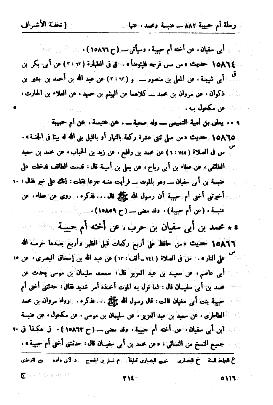 15865 -[س] حديث من صلى ثنتي عشرة ركعة بالنهار أو بالليل بنى الله له بيتاً في الجنة. س في الصلاة (744: 6) عن محمد بن رافع، عن زيد بن الحباب، عن محمد بن سعيد الطائفي، عن عطاء بن أبي رباح، عن يعلى بن أمية قال: قدمت الطائف فدخلت على عنبسة بن أبي سفيان - وهو بالموت - فرأيت منه جزعاً فقلت: إنك على خير فقال: أخبرتني أختي أم حبيبة أن رسول الله صَلَّى اللَّهُ عَلَيْهِ وَسَلَّمَ قال: ... فذكره. روى عن عطاء، عن عنبسة (عن أم حبيبة) ، وقد مضى - (ح 15859) .