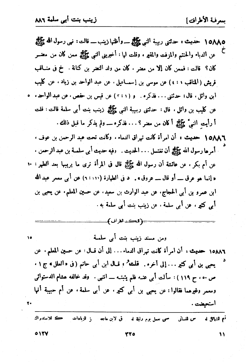 15885 -[خ] حديث: حدثني ربيبة النبي صَلَّى اللَّهُ عَلَيْهِ وَسَلَّمَ - وأظنها زينب - قالت: نهى رسول الله صَلَّى اللَّهُ عَلَيْهِ وَسَلَّمَ عن الدباء والحنتم والمزفت والمقير، وقلت لها: أخبريني النبي صَلَّى اللَّهُ عَلَيْهِ وَسَلَّمَ ممن كان من مضر كان؟ قالت: فممن كان إلا من مضر، كان من ولد النضر بن كنانة. خ في مناقب قريش (المناقب 1: 4) عن موسى بن إسماعيل، عن عبد الواحد بن زياد، عن كليب بن وائل، قال: حدثتني ... فذكره. و (1: 3) عن قيس بن حفص، عن عبد الواحد، عن كليب بن وائل، قال: حدثتني ربيبة النبي صَلَّى اللَّهُ عَلَيْهِ وَسَلَّمَ زينب بنت أبي سلمة قالت: قلت: أرأيتِ النبيَّ صَلَّى اللَّهُ عَلَيْهِ وَسَلَّمَ أكان من مضر؟ ... فذكره - ولم يذكر ما قبل ذلك.