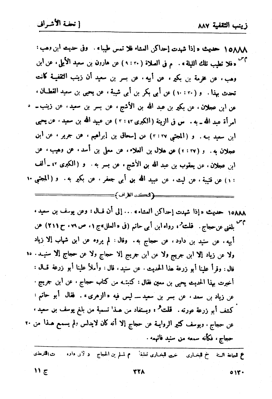 15888 -[م س] حديث إذا شهدت إحداكن العشاء فلا تمس طيباً. وفي حديث ابن وهب: فلا تطيب تلك الليلة. م في الصلاة (30: 9) عن هارون بن سعد الأيلي، عن ابن وهب، عن مخرمة بن بكير، عن أبيه، عن بسر بن سعيد أن زينب الثقفية كانت تحدث بهذا. و (30: 10) عن أبي بكر بن أبي شيبة، عن يحيى بن سعيد القطان، عن ابن عجلان، عن بكير بن عبد الله بن الأشج، عن بسر بن سعيد، عن زينب - امرأة عبد الله - به. س في الزينة (الكبرى 43: 3) عن عبيد الله بن سعيد، عن يحيى بن سعيد به. و (المجتبى -[329]- 37: 3) عن إسحاق بن إبراهيم، عن جرير، عن ابن عجلان به. و (27: 3) عن هلال بن العلاء، عن معلى بن أسد، عن وهيب، عن ابن عجلان، عن يعقوب بن عبد الله بن الأشج، عن بسر به. و (الكبرى 42 - ألف: 1) عن قتيبة، عن ليث، عن عبيد الله بن أبي جعفر، عن بكير به. و (المجتبي 37: 4) عن أحمد بن سعيد بن يعقوب الحمصي، عن عثمان بن سعيد، عن الليث، عن بكير به - ولم يذكر ابن أبي جعفر. و (الكبرى 43 - ب: 2) عن أحمد بن سعيد - وهو الرباطي -، عن يعقوب بن إبراهيم بن سعد، عن أبيه إبراهيم بن سعد، عن صالح بن كيسان، عن محمد بن عبد الله بن عمرو بن هشام، عن بكير به. و (المجتبى 37: 5) عن عمرو بن علي، عن أبي داود - و (37: 6) عن أبي بكر بن علي، عن منصور بن أبي مزاحم - كلاهما عن إبراهيم بن سعد 1، عن محمد بن عبد الله بن عمرو بن هشام به - ولم يذكرا صالح بن كيسان. و (37: 7) عن يوسف بن سعيد، قال: بلغني عن حجاج، عن ابن جريج، قال: أخبرني زياد بن سعد، عن ابن شهاب الزهري، عن بسر بن سعيد به. وقال: هذا حديث غير محفوظ من حديث الزهري، وحديث يحيى وجرير أولى من حديث وهيب، وحديث قتيبة أولى بالصواب من حديث عثمان، وحديث يعقوب بن إبراهيم بن سعد، عن أبيه أولى بالصواب - يعني من حديث أبي داود ومنصور بن أبي مزاحم. ز رواه يعقوب بن إبراهيم الدورقي، عن إسماعيل ابن علية، عن عبد الرحمن بن إسحاق، عن محمد بن عبد الله بن عمرو بن هشام، عن بكير بن الأشج، عن بسر بن سعيد، عن زيد بن خالد الجهني، قال: قال رسول الله صَلَّى اللَّهُ عَلَيْهِ وَسَلَّمَ: لا تمنعوا إماء الله مساجد الله، وليخرجن تفلات.