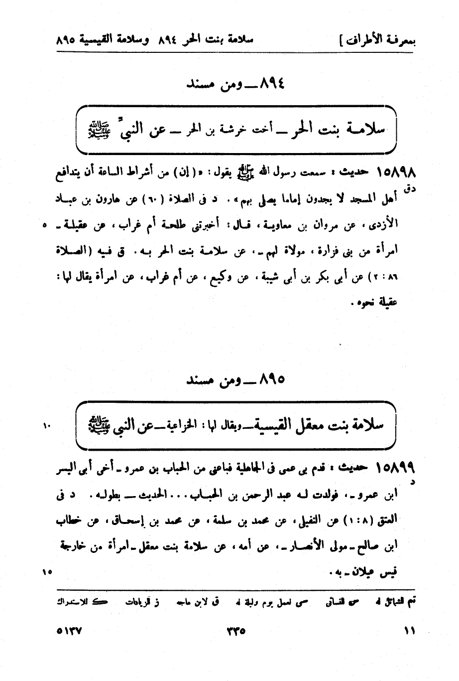 15898 -[د ق] حديث: سمعت رسول الله صَلَّى اللَّهُ عَلَيْهِ وَسَلَّمَ يقول: (إن) من أشراط الساعة أن يتدافع أهل المسجد لا يجدون إماماً يصلي بهم. د في الصلاة (60) عن هارون بن عباد الأزدي، عن مروان بن معاوية، قال: أخبرتني طلحة أم غراب، عن عقيلة - امرأة من بني فزارة، مولاة لهم -، عن سلامة بنت الحر به. ق فيه (الصلاة 86: 2) عن أبي بكر بن أبي شيبة، عن وكيع، عن أم غراب، عن امرأة يقال لها: عقيلة نحوه.