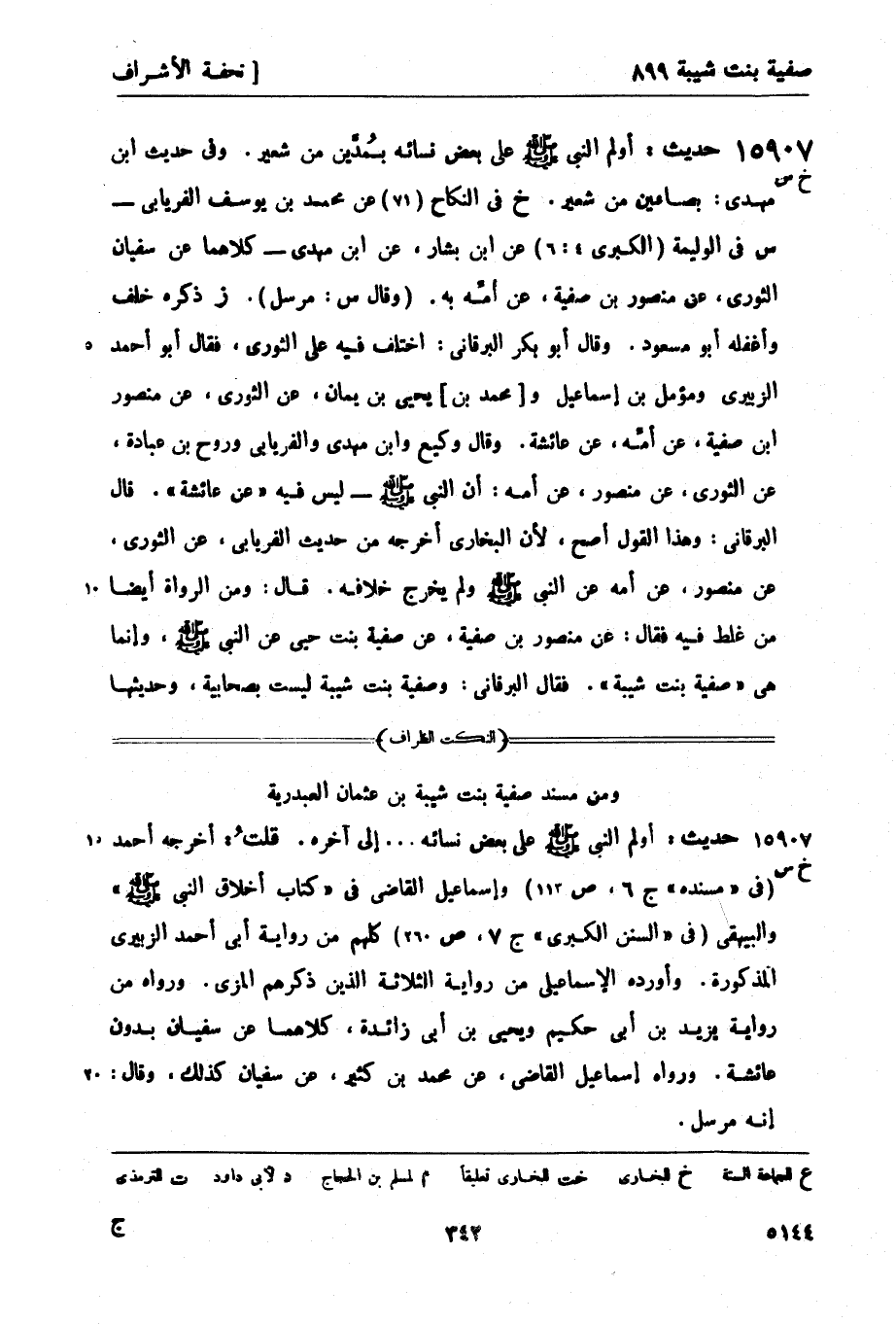 15907 -[خ س] حديث: أولم النبي صَلَّى اللَّهُ عَلَيْهِ وَسَلَّمَ على بعض نسائه بمُدَّين من شعير. وفي حديث ابن مهدي بصاعين من شعير. خ في النكاح (71) عن محمد بن يوسف الفريابي - س في الوليمة (الكبرى 4: 6) عن ابن بشار، عن ابن مهدي - كلاهما عن سفيان الثوري، عن منصور ابن صفية، عن أُمِّه به. (وقال س: مرسل) . ز ذكره خلف وأغفله أبو مسعود. وقال أبو بكر البرقاني: اختلف فيه على الثوري، فقال أبو أحمد الزبيري ومؤمل بن إسماعيل و [محمد بن] يحيى بن يمان، عن الثوري، عن منصور ابن صفية، عن أمِّه، عن عائشة. وقال وكيع وابن مهدي والفريابي وروح بن عبادة، عن الثوري، عن منصور، عن أمه: أن النبي صَلَّى اللَّهُ عَلَيْهِ وَسَلَّمَ - ليس فيه عن عائشة. قال البرقاني: وهذا القول أصح، لأن البخاري أخرجه من حديث الفريابي، عن الثوري، عن منصور، عن أمه أن النبي صَلَّى اللَّهُ عَلَيْهِ وَسَلَّمَ ولم يخرج خلافه. قال: ومن الرواة أيضاً من غلط فيه فقال: عن منصور ابن صفية، عن صفية بنت حيى عن النبيّ صَلَّى اللَّهُ عَلَيْهِ وَسَلَّمَ، وإنما هي صفية بنت شيبة. فقال البرقاني: وصفية بنت شيبة ليست بصحابية، وحديثها -[343]- مرسل وإن كان البخاري أخرجه. قال: ورأيت في كتاب أبي عبد الرحمن أحمد بن شعيب النسائي قد نصر قول من لم يقل عن عائشة، وأورده من حديث بندار، عن ابن مهدي وقال: إنه مرسل.