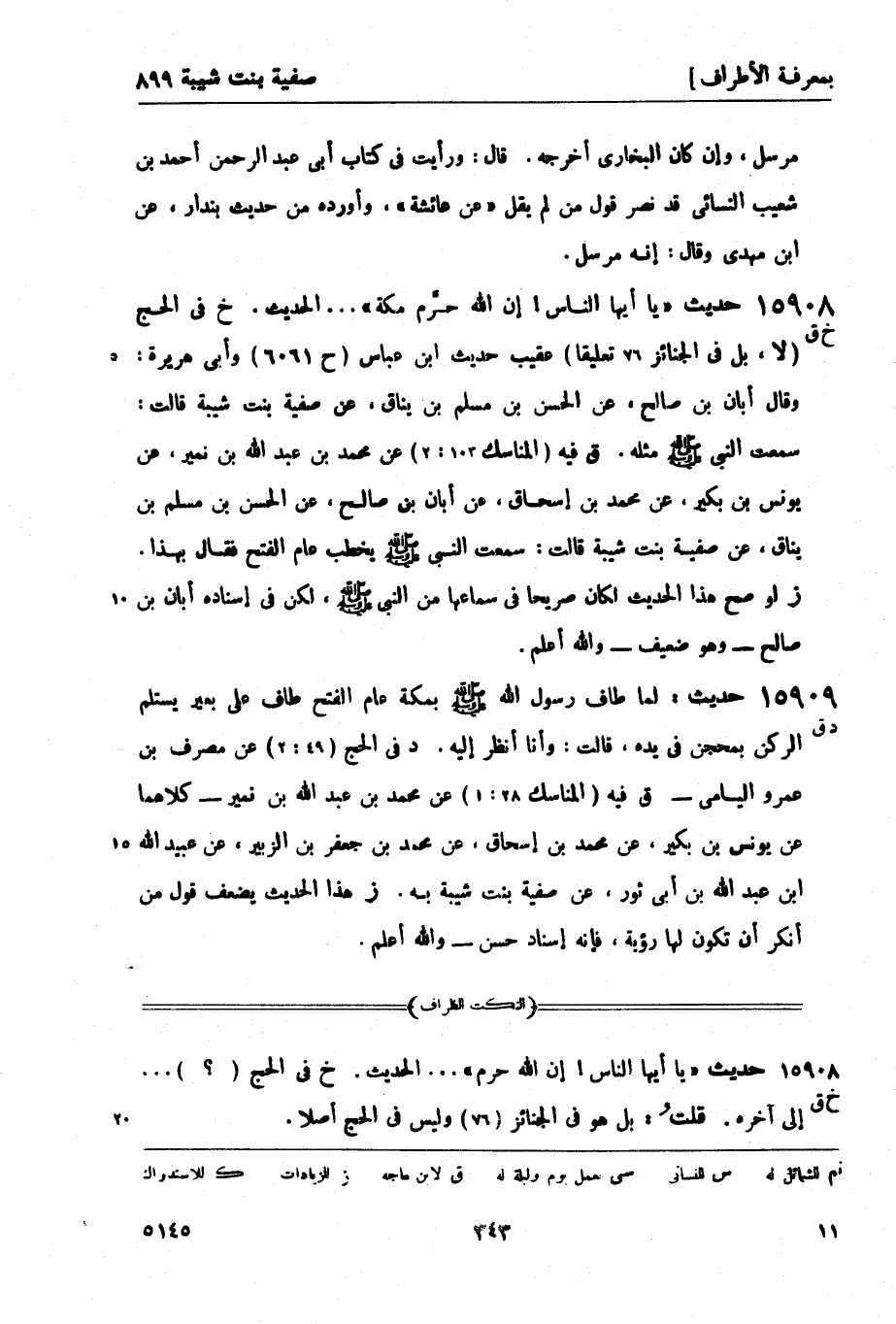 15908 -[خ ق] حديث يا أيها الناس! إن الله حرَّم مكة ... الحديث. خ في الحج (لا، بل في الجنائز 76 تعليقاً) عقيب حديث ابن عباس (ح 6061) وأبي هريرة: وقال أبان بن صالح، عن الحسن بن مسلم بن يناق، عن صفية بنت شيبة قالت: سمعت النبي صَلَّى اللَّهُ عَلَيْهِ وَسَلَّمَ مثله. ق فيه (المناسك 103: 2) عن محمد بن عبد الله بن نمير، عن يونس بن بكير، عن محمد بن إسحاق، عن أبان بن صالح، عن الحسن بن مسلم بن يناق، عن صفية بنت شيبة قالت: سمعت النبي صَلَّى اللَّهُ عَلَيْهِ وَسَلَّمَ يخطب عام الفتح فقال بهذا. ز لو صح هذا الحديث لكان صريحاً في سماعها من النبيّ صَلَّى اللَّهُ عَلَيْهِ وَسَلَّمَ، لكن في إسناده أبان بن صالح - وهو ضعيف - والله أعلم.