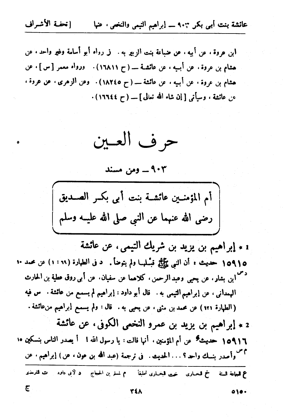 15916 -[م س] حديثٌ عن أم المؤمنين أنها قالت: يا رسول الله! أيصدر الناس بنسكين وأصدر بنسك واحد؟ ... الحديث. في ترجمة (عبد الله بن عون، عن) إبراهيم، عن -[349]- الأسود، عن عائشة - (ح 15971) . وفي ترجمة عبد الله بن عون، عن القاسم، عن عائشة - (ح 17467) .