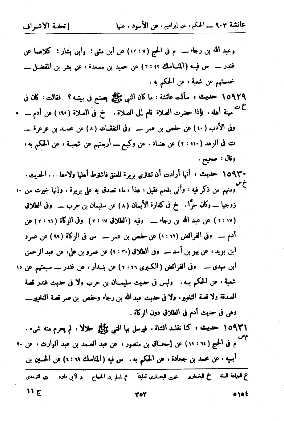 15930 -[خ س] حديث: أنها أرادت أن تشتري بريرة للعتق فاشترط أهلها ولاءها ... الحديث. ومنهم من ذكر فيه: وأُتي بلحم فقيل: هذا (ما) تصدق به على بريرة، وإنها خيرت من زوجها - وكان حرَّاً. خ في كفارة الأيمان (8) عن سليمان بن حرب - وفي الطلاق (17: 1) عن عبد الله بن رجاء - وفيه (الطلاق 17: 2) وفي الزكاة (61: 2) عن آدم - وفي الفرائض (19: 1) عن حفص بن عمر - س في الزكاة (99) عن عمرو بن يزيد، عن بهز بن أسد - وفي الطلاق (30: 2) عن عمرو بن علي، عن عبد الرحمن بن مهدي - وفي الفرائض (الكبرى 26: 2) عن بندار، عن غندر - سبعتهم عن شعبة، عن الحكم به. وليس في حديث سليمان بن حرب ولا في حديث غندر قصة الصدقة ولا قصة التخيير، ولا في حديث عبد الله بن رجاء وحفص بن عمر قصة التخيير - وهي في حديث آدم في الطلاق دون الزكاة.