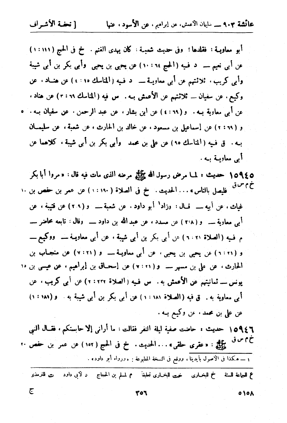 15945 -[خ م س ق] حديث: لما مرض رسول الله صَلَّى اللَّهُ عَلَيْهِ وَسَلَّمَ مرضه الذي مات فيه قال: مروا أبا بكر فليصل بالناس ... الحديث. خ في الصلاة (190: 1) عن عمر بن حفص بن غياث، عن أبيه - قال: وزاد 1 أبو داود، عن شعبة - و (29) عن قتيبة، عن أبي معاوية - و (218) عن مسدد، عن عبد الله بن داود - وقال: تابعه محاضر - م فيه (الصلاة 21: 6) عن أبي بكر بن أبي شيبة، عن أبي معاوية - ووكيع - و (21: 6) عن يحيى بن يحيى، عن أبي معاوية - و (21: 7) عن منجاب بن الحارث، عن علي بن مسهر - و (21: 7) عن إسحاق بن إبراهيم، عن عيسى بن يونس - ثمانيتهم عن الأعمش به. س فيه (الصلاة 232: 2) عن أبي كريب، عن أبي معاوية به. ق فيه (الصلاة 181: 1) عن أبي بكر بن أبي شيبة به. و (181: 1) عن علي بن محمد، عن وكيع به.