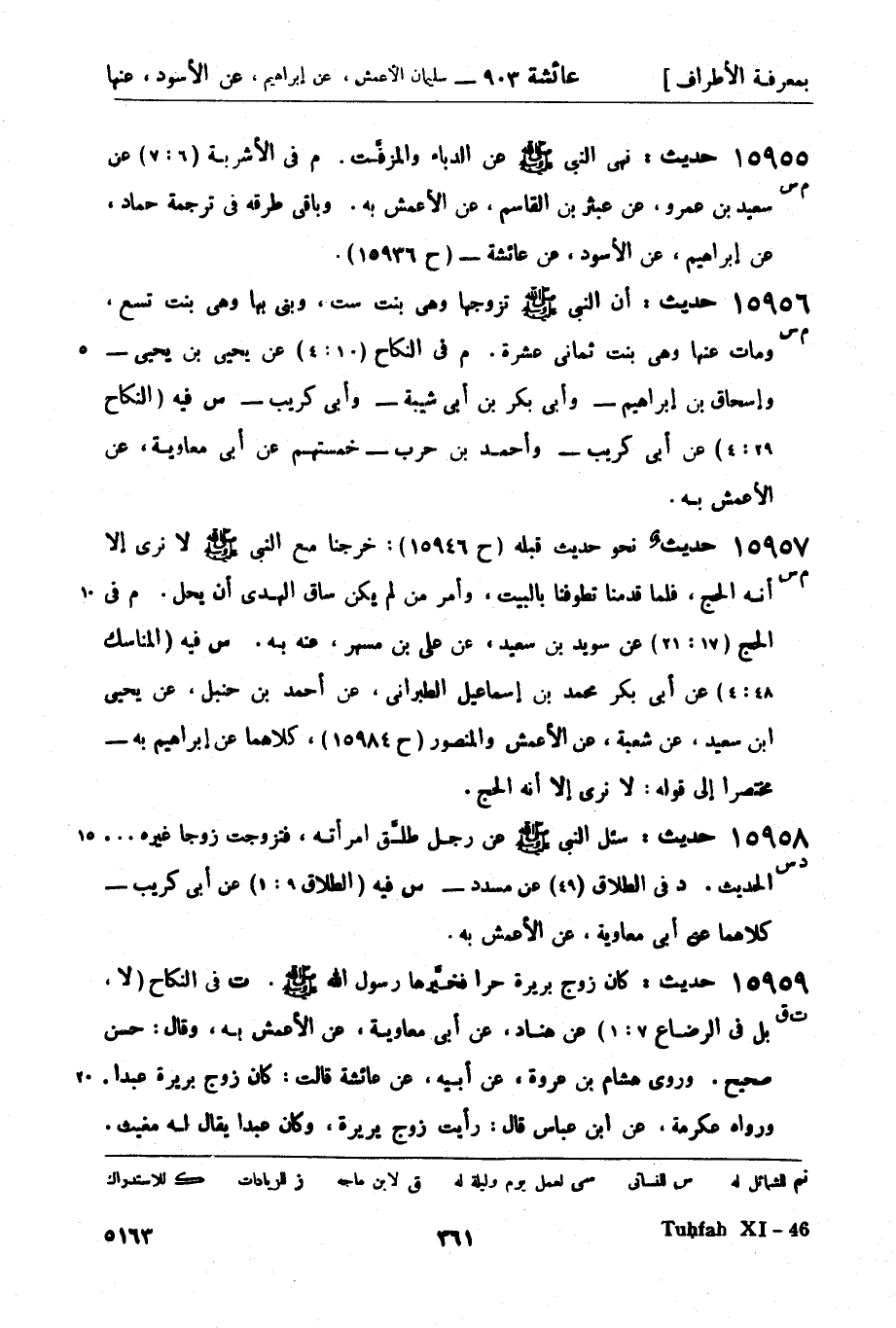 15956 -[م س] حديث: أن النبي صَلَّى اللَّهُ عَلَيْهِ وَسَلَّمَ تزوجها وهي بنت ست، وبنى بها وهي بنت تسع، ومات عنها وهي بنت ثماني عشرة. م في النكاح (10: 4) عن يحيى بن يحيى - وإسحاق بن إبراهيم - وأبي بكر بن أبي شيبة - وأبي كريب - س فيه (النكاح 29: 4) عن أبي كريب - وأحمد بن حرب - خمستهم عن أبي معاوية، عن الأعمش به.