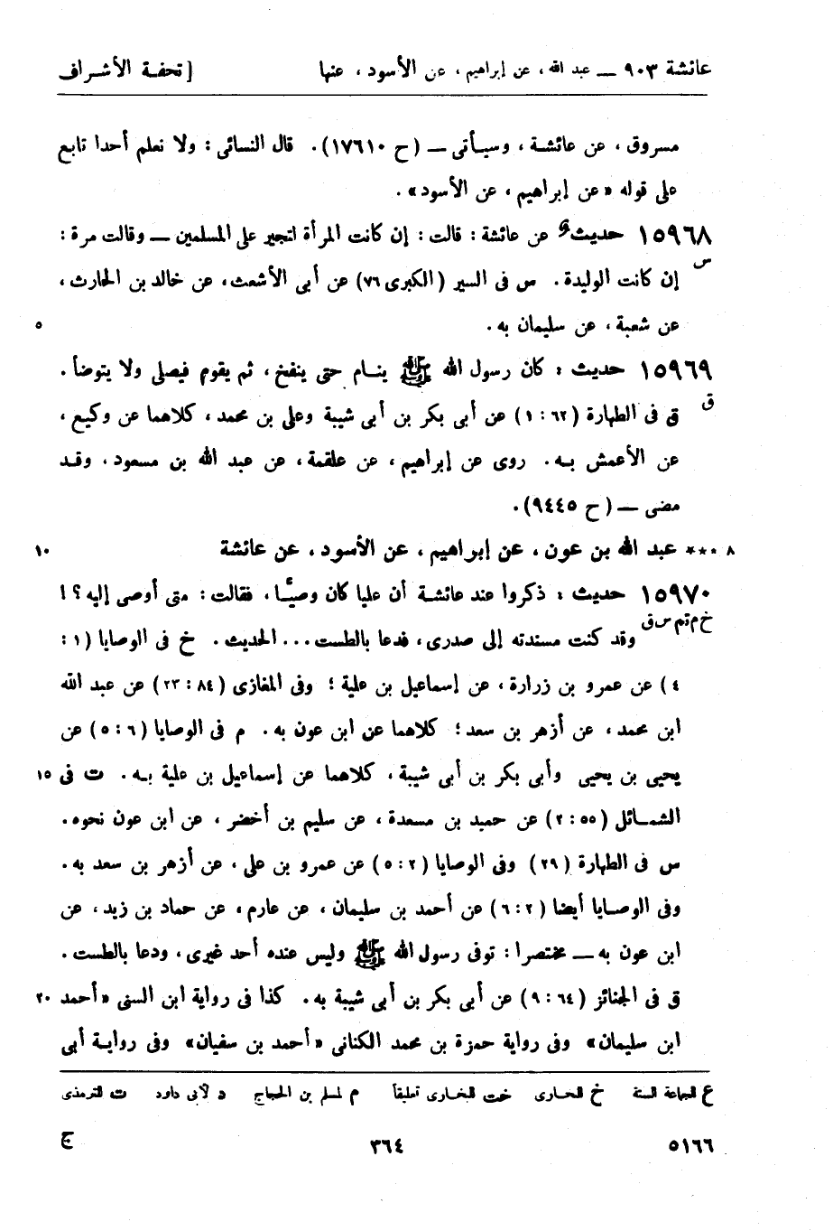 15970 -[خ م تم س ق] حديث: ذكروا عند عائشة أن علياً كان وصيَّاً، فقالت: متى أوصي إليه؟ ! وقد كنت مسندته إلى صدري، فدعا بالطست ... الحديث. خ في الوصايا (1: 4) عن عمرو بن زرارة، عن إسماعيل ابن علية؛ وفي المغازي (84: 23) عن عبد الله بن محمد، عن أزهر بن سعد؛ كلاهما عن ابن عون به. م في الوصايا (6: 5) عن يحيى بن يحيى وأبي بكر بن أبي شيبة، كلاهما عن إسماعيل ابن علية به. ت في الشمائل (55: 2) عن حميد بن مسعدة، عن سليم بن أخضر، عن ابن عون نحوه. س في الطهارة (29) وفي الوصايا (2: 5) عن عمرو بن علي، عن أزهر بن سعد به. وفي الوصايا أيضاً (2: 6) عن أحمد بن سليمان، عن عارم، عن حماد بن زيد، عن ابن عون به - مختصراً: توفي رسول الله صَلَّى اللَّهُ عَلَيْهِ وَسَلَّمَ وليس عنده أحد غيري، ودعا بالطست. ق في الجنائز (64: 9) عن أبي بكر بن أبي شيبة به. كذا في رواية ابن السني أحمد بن سليمان وفي رواية حمزة بن محمد الكناني أحمد بن سفيان وفي رواية أبي -[365]- الحسن بن حيويه أحمد بن نصر.