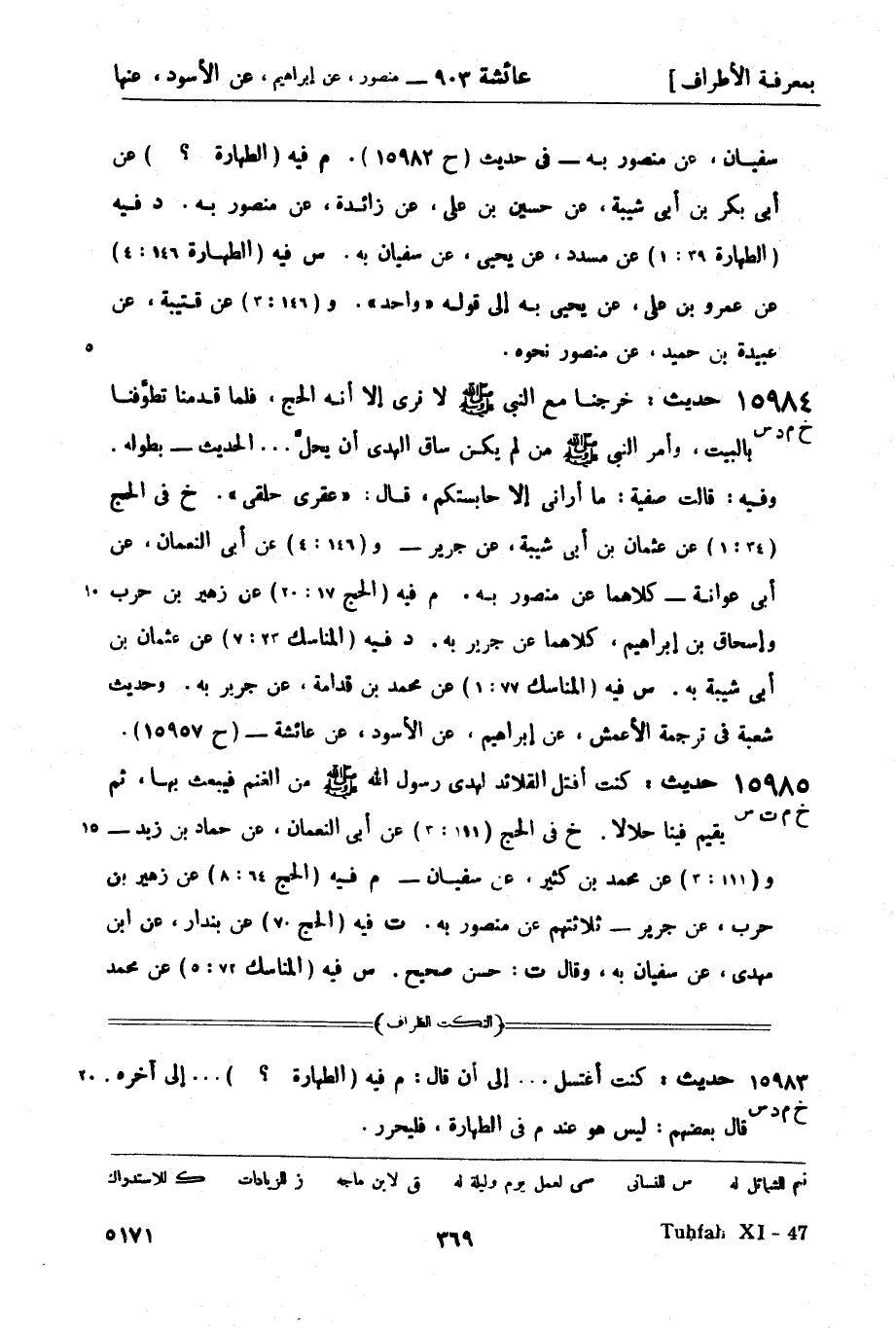 15984 -[خ م د س] حديث: خرجنا مع النبي صَلَّى اللَّهُ عَلَيْهِ وَسَلَّمَ لا نرى إلا أنه الحج، فلما قدمنا تطوَّفنا بالبيت، وأمر النبي صَلَّى اللَّهُ عَلَيْهِ وَسَلَّمَ من لم يكن ساق الهدي أن يحلَّ ... الحديث - بطوله. وفيه: قالت صفية: ما أراني إلا حابستكم، قال: عقري حلقي. خ في الحج (34: 1) عن عثمان بن أبي شيبة، عن جرير - و (146: 4) عن أبي النعمان، عن أبي عوانة - كلاهما عن منصور به. م فيه (الحج 17: 20) عن زهير بن حرب وإسحاق بن إبراهيم، كلاهما عن جرير به. د فيه (المناسك 23: 7) عن عثمان بن أبي شيبة به. س فيه (المناسك 77: 1) عن محمد بن قدامة، عن جرير به. وحديث شعبة في ترجمة الأعمش، عن إبراهيم، عن الأسود، عن عائشة - (ح 15957)