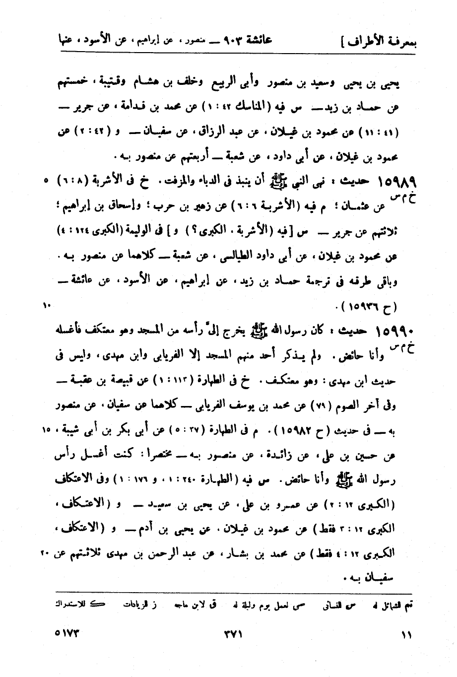 15990 - حديث: كان رسول الله صَلَّى اللَّهُ عَلَيْهِ وَسَلَّمَ يخرج إليَّ رأسه من المسجد وهو معتكف فأغسله وأنا حائض. ولم يذكر أحد منهم المسجد إلا الفريابي وابن مهدي، وليس في حديث ابن مهدي: وهو معتكف. خ في الطهارة (113: 1) عن قبيصة بن عقبة - وفي آخر الصوم (79) عن محمد بن يوسف الفريابي - كلاهما عن سفيان، عن منصور به - في حديث (ح 15982) . م في الطهارة (37: 5) عن أبي بكر بن أبي شيبة، عن حسين بن علي، عن زائدة، عن منصور به - مختصراً: كنت أغسل رأس رسول الله صَلَّى اللَّهُ عَلَيْهِ وَسَلَّمَ وأنا حائض. س فيه (الطهارة 240: 1، و176: 1) وفي الاعتكاف (الكبرى 12: 2) عن عمرو بن علي، عن يحيى بن سعيد - و (الاعتكاف، الكبرى 12: 3 فقط) عن محمود بن غيلان، عن يحيى بن آدم - و (الاعتكاف الكبرى 12: 4 فقط) عن محمد بن بشار، عن عبد الرحمن بن مهدي ثلاثتهم عن سفيان به.