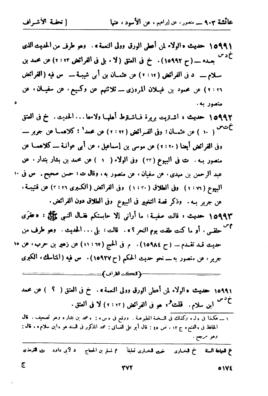 15991 -[خ د س] حديث الولاء لمن أعطى الورق وولي النعمة. وهو طرف من الحديث الذي بعده - (ح 15992) . خ في العتق (لا، بل في الفرائض 23: 3) عن محمد بن سلام - د في الفرائض (12: 2) عن عثمان بن أبي شيبة - س فيه (الفرائض 26: 2) عن محمود بن غيلان المروزي - ثلاثتهم عن وكيع، عن سفيان، عن منصور به.