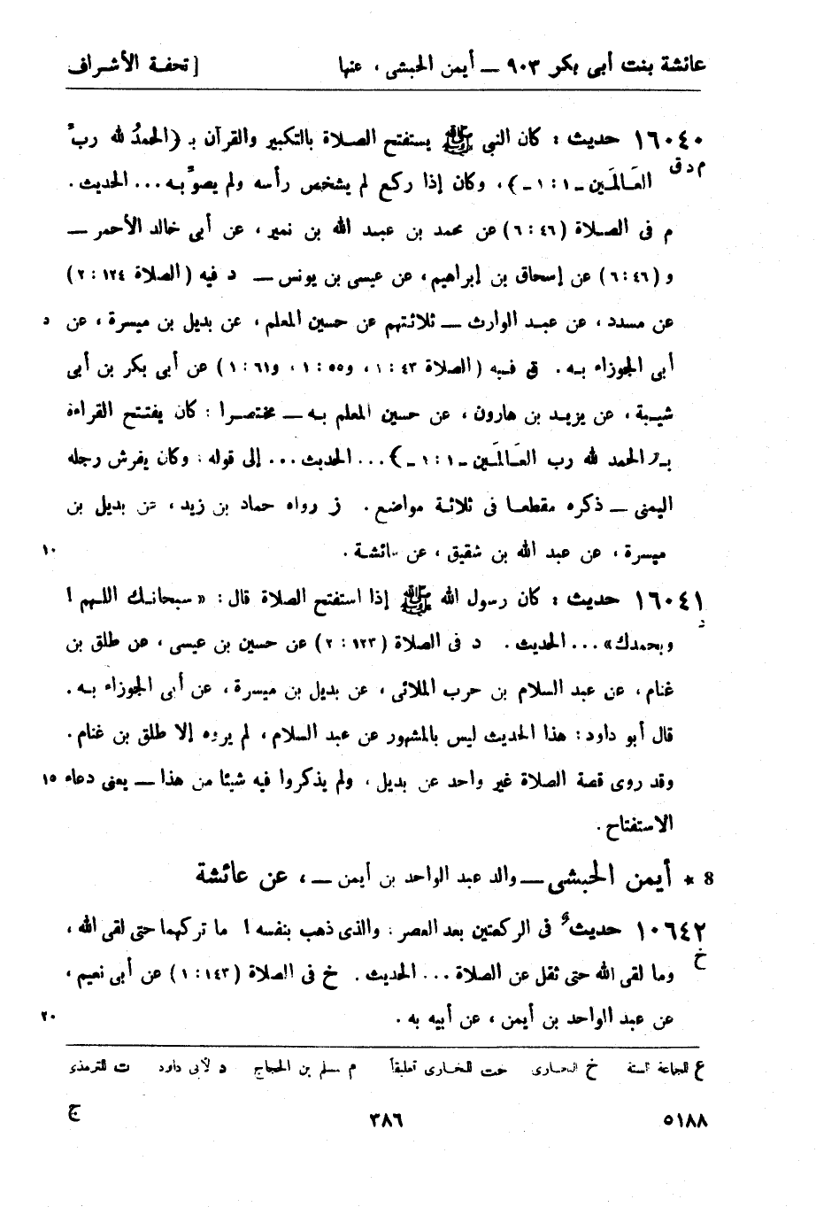 16040 -[م د ق] حديث: كان التي صَلَّى اللَّهُ عَلَيْهِ وَسَلَّمَ يستفتح الصلاة بالتكبير والقرآن ب الحمد لله رب العالمين (- 1: 1 -) ، وكان إذا ركع لم يشخص رأسه ولم يصوِّبه ... الحديث. م في الصلاة (46: 6) عن محمد بن عبد الله بن نمير، عن أبي خالد الأحمر - و (46: 6) عن إسحاق بن إبراهيم، عن عيسى بن يونس - د فيه (الصلاة 124: 2) عن مسدد، عن عبد الوارث - ثلاثتهم عن حسين المعلم، عن بديل بن ميسرة، عن أبي الجوزاء به. ق فيه (الصلاة 43: 1 و55: 1 و61: 1) عن أبي بكر بن أبي شيبة، عن يزيد بن هارون، عن حسين المعلم به - مختصراً: كان يفتتح القراءة ب الحمد لله رب العالمين - (1: 1 -) ... الحديث ... إلى قوله: وكان يفرش رجله اليمنى - ذكره مقطعاً في ثلاثة مواضع. ز رواه حماد بن زيد، عن بديل بن ميسرة، عن عبد الله بن شقيق، عن عائشة.