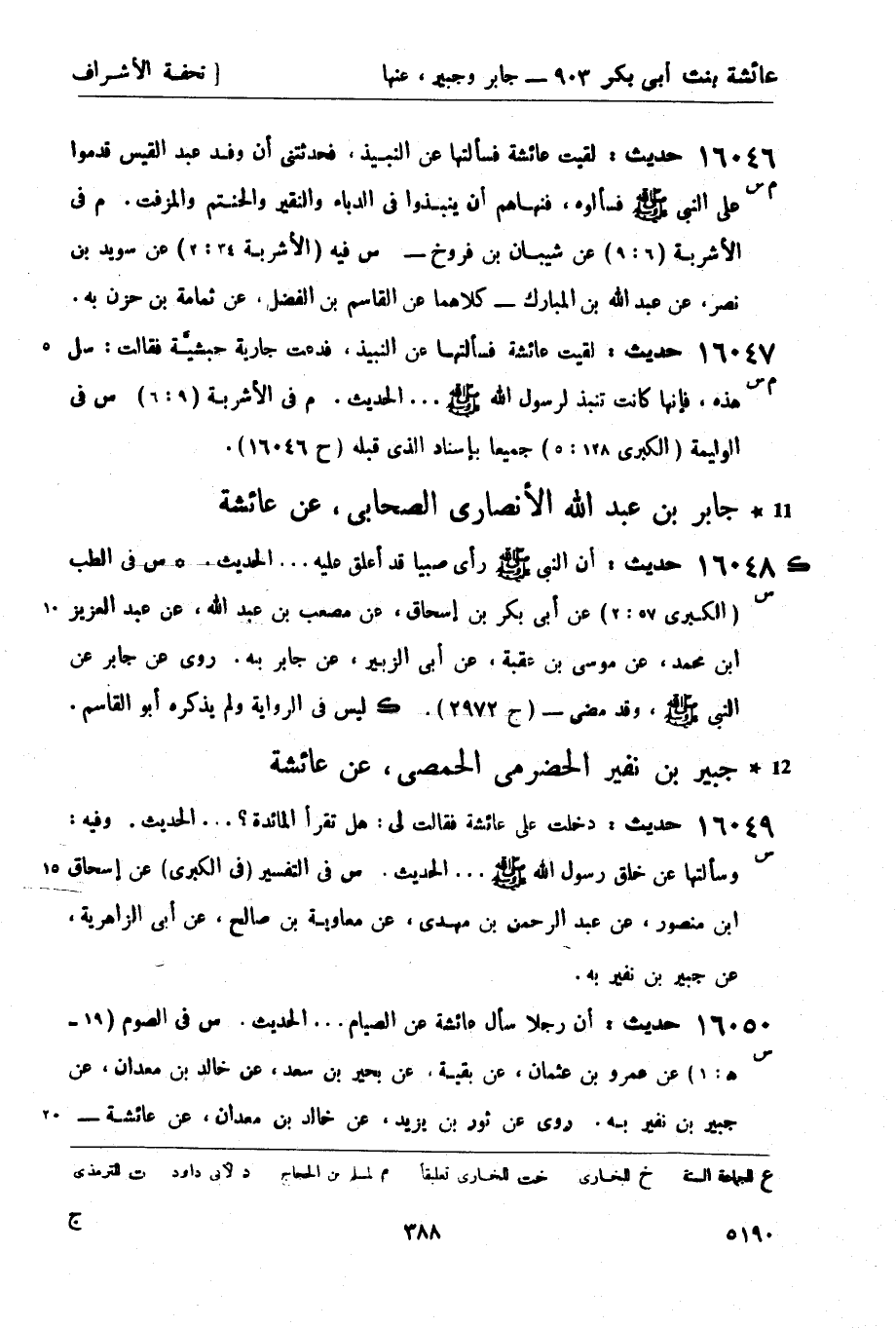 16047 -[م س] حديث: لقيت عائشة فسألتها عن النبيذ، فدعت جارية حبشيَّة فقالت: سل هذه، فإنها كانت تنبذ لرسول الله صَلَّى اللَّهُ عَلَيْهِ وَسَلَّمَ ... الحديث. م في الأشربة (9: 6) س في الوليمة (الكبرى 128: 5) جميعاً بإسناد الذي قبله (ح 16046) .