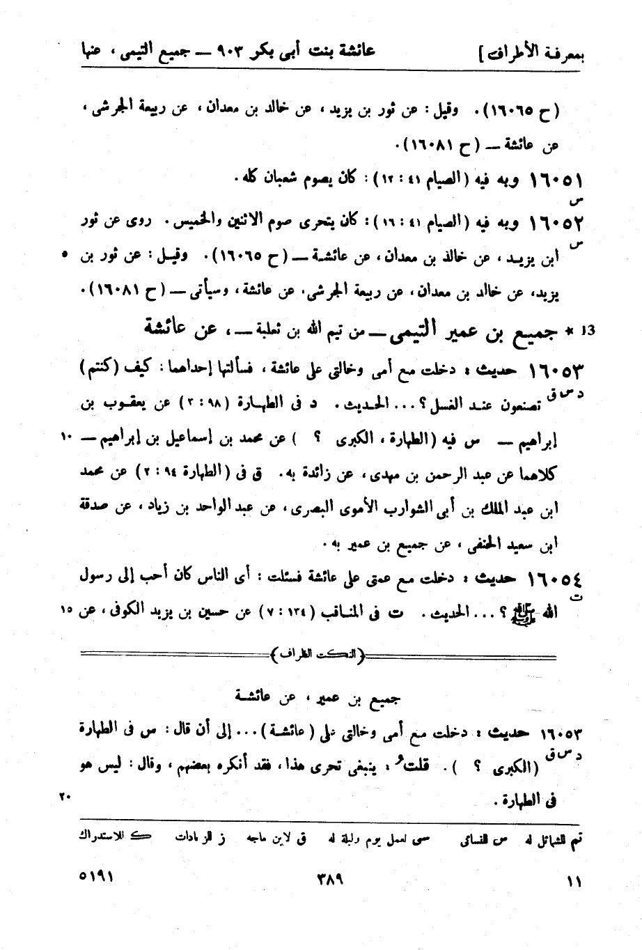 16054 -[ت] حديث: دخلت مع عمتي على عائشة فسئلت: أي الناس أحب إلى رسول الله صَلَّى اللَّهُ عَلَيْهِ وَسَلَّمَ؟ ... الحديث. ت في المناقب (134: 7) عن حسين بن يزيد الكوفي، عن -[390]- عبد السلام بن حرب، عن أبي الجحَّاف داود بن أبي عوف، عن جميع بن عمير به، وقال: حسن غريب.