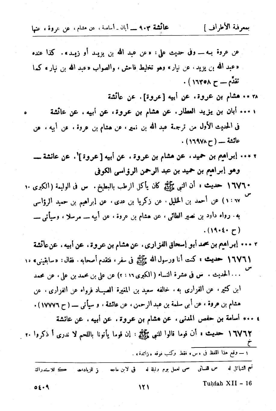 أبان بن يزيد العطار، عن هشام بن عروة، عن أبيه، عن عائشة في الحديث الأول من ترجمة عبد الله بن نمير، عن هشام بن عروة، عن أبيه، عن عائشة - (ح 16978) .