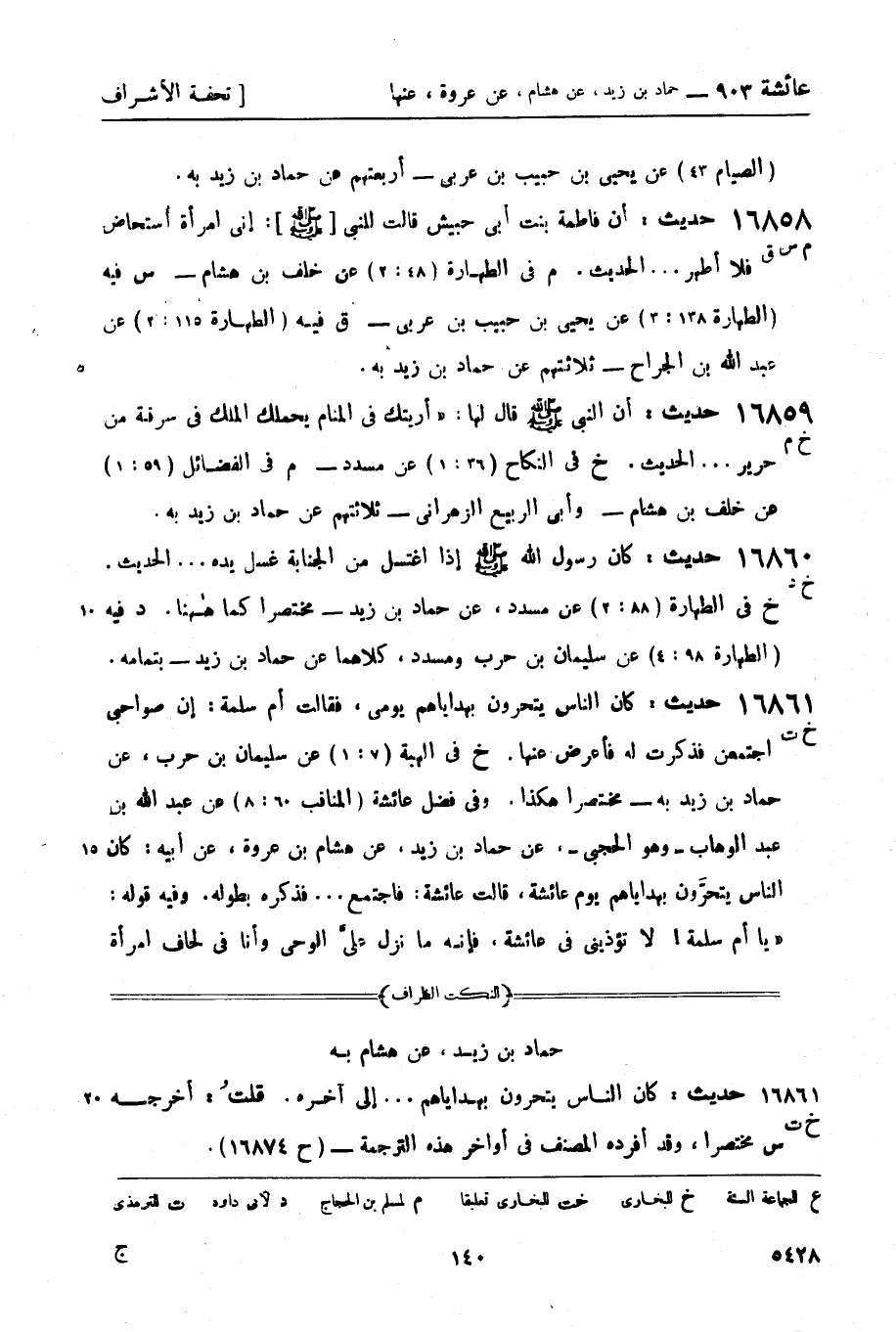 خ في الهبة (7: 1) ، عن سليمان بن حرب، عن حماد بن زيد به - مختصراً هكذا. وفي فضل عائشة (المناقب 60: 8) عن عبد الله بن عبد الوهاب - وهو الحجبي -، عن حماد بن زيد، عن هشام بن عروة، عن أبيه: كان الناس يتحرَّون بهداياهم يوم عائشة، قالت عائشة: فاجتمع ... فذكره بطوله. وفيه قوله: يا أم سلمة! لا تؤذيني في عائشة، فإنه ما نزل عليَّ الوحي وأنا في لحاف امرأة -[141]- منكن غيرها.
